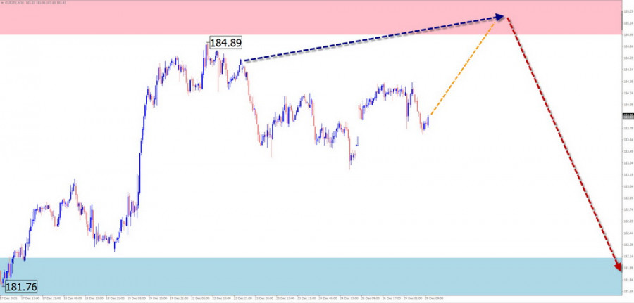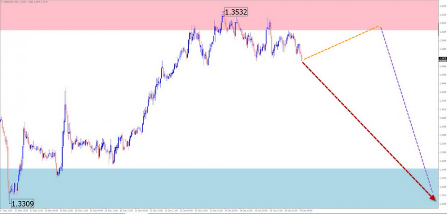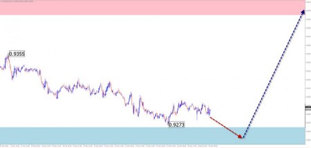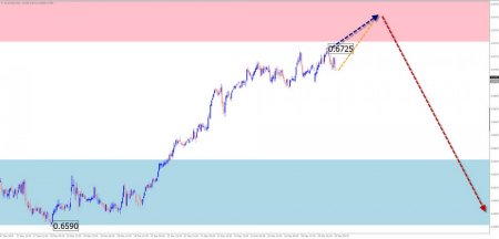 GBP/USD Краткий анализ: Незавершённая восходящая волновая модель на графике мажорной пары английского фунта стерлингов ведёт отчёт с начала текущего года. С начала ноября от мощной зоны поддержки после сформированной коррекции котировки стали формировать начало заключительной части (С). Ее структура на момент анализа не выглядит сформированной. Цена находится у верхней границы мощной потенциально-разворотной зоны. Прогноз на неделю: На протяжении предстоящей недели ожидается завершение бокового вектора движения фунта. Не исключено давление на верхнюю границу сопротивления. К концу недели можно рассчитывать на формировании разворота и начало ценового снижения, при общем флетовом характере движений. Подъем волатильности вероятен уже в следующем году. Зоны потенциального разворота Сопротивление: - 1.3510/1.3560 Поддержка: - 1.3350/1.3300 Рекомендации Покупки: имеют малый потенциал, несут высокую долю риска. Продажи: станут актуальными после появления в районе зоны сопротивления подтвержденных сигналов разворота на ваших ТС. AUD/USD Краткий анализ: На графике мажорной пары австралийского доллара основное направление с апреля задает восходящий тренд. Последний незавершенный на сегодня участок стартовал 21 ноября. Отсюда в структуре формируется начало заключительной части (С). Цена достигла нижней границы зоны потенциального разворота. Сигналов скорого разворота на графике пока не наблюдается. Прогноз на неделю: В первые дни предстоящего недельного периода можно ждать продолжение общего восходящего курса движения. После контакта с зоной расчетного сопротивления далее можно рассчитывать на смену вектора и начало снижения цены, вплоть до границ поддержки. Зоны потенциального разворота Сопротивление: - 0.6730/0.6780 Поддержка: - 0.6640/0.6590 Рекомендации Покупки: возможны малым лотом в рамках отдельных сессий, рискованны. Продажи: после появления подтвержденных сигналов разворота в районе сопротивления могут использоваться в торговле. USD/CHF Краткий анализ: Направление ценовых движений на графике швейцарского франка с августа задает алгоритм восходящей растянутой плоскости. В структуре волны в виде сдвигающейся/растянутой плоскости близится к завершению средняя часть (В). Котировки перемещаются вдоль верхней границы широкой зоны потенциального разворота дневного ТФ. Прогноз на неделю: В начале текущей недели ожидается общий флетовый вектор движения, с перемещением цены вдоль расчётной поддержки. Рост волатильности, разворот и смену курса движения можно ждать к концу недели. Зоны потенциального разворота Сопротивление: - 0.8080/0.9080 Поддержка: - 0.7860/0.7810 Рекомендации Продажи: для таких сделок условий на рынке пары нет. Покупки: могут использоваться в торговле после появления подтвержденных сигналов разворота. EUR/JPY Краткий анализ: Актуальная на момент анализа волновая конструкция кросса евро/японская йена восходящая, от конца февраля. В последние два месяца в ней скрыто формируется сдвигающаяся плоскость, не завершенная на момент анализа. Цена в последнюю декаду находится в рамках зоны потенциального разворота ТФ Н1. Прогноз на неделю: В ближайшие дни ожидается продолжение общего флетового настроя движения, с восходящим вектором. В районе расчётного сопротивления высока вероятность перехода в боковой дрейф, с формированием условий для разв