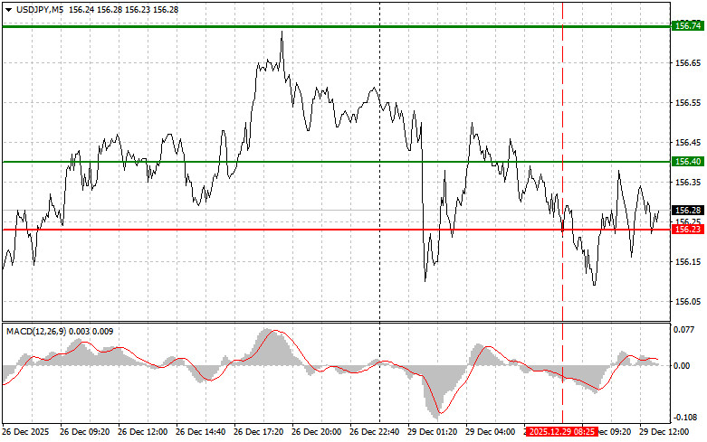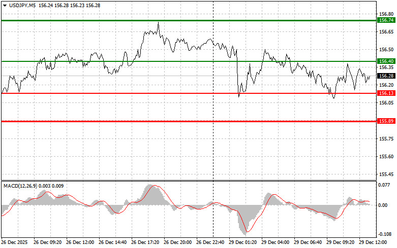 Разбор сделок и советы по торговле японской иенойТест цены 156.23 пришелся на момент, когда индикатор MACD много прошел вниз от нулевой отметки, что ограничивало нисходящий потенциал пары. По этой причине я не продавал доллар.Во второй половине дня будет опубликован отчет о количестве незавершенных сделок купли-продажи на американском рынке недвижимости. Этот индикатор обычно считается предвестником активности в жилищном секторе, показывая число подписанных договоров на приобретение жилья, ожидающих завершения. Эксперты внимательно его отслеживают для оценки текущего здоровья и будущих тенденций рынка недвижимости. Превышение прогнозов может спровоцировать рост курса доллара США и ослабление японской иены. И наоборот, более слабые данные могут оказать понижательное давление на американскую валюту. Но, влияние отчета, если и будет, то будет кратковременным, учитывая приближение праздников. Тем не менее, краткосрочные колебания курса USD/JPY вполне вероятны.Что касается внутридневной стратегии, то больше буду опираться на реализацию сценариев №1 и №2.Сигнал на покупкуСценарий №1: покупать USD/JPY сегодня планирую при достижении точки входа в районе 156.40 (зеленая линия на графике) с целью роста к уровню 156.74 (более толстая зеленая линия на графике). В районе 156.74 буду выходить из покупок и открывать продажи в обратную сторону (расчет на движение в 30-35 пунктов в обратную сторону от уровня). Рассчитывать на рост пары можно в продолжение тренда. Важно! Перед покупкой, убедитесь в том, что индикатор MACD находится выше нулевой отметки и только начинает свой рост от нее.Сценарий №2: покупать USD/JPY сегодня также планирую в случае двух подряд тестов цены 156.13 в момент, когда индикатор MACD будет находиться в области перепроданности. Это ограничит нисходящий потенциал пары и приведет к обратному развороту рынка вверх. Можно ожидать рост к противоположным уровням 156.40 и 156.74.Сигнал на продажу Сценарий №1: продавать USD/JPY сегодня планирую после обновления уровня 156.13 (красная линия на графике), что приведет к быстрому снижению пары. Ключевой целью продавцов будет уровень 155.89, где буду выходить из продаж, а также открывать сразу покупки в обратную сторону (расчет на движение в 20-25 пунктов в обратную сторону от уровня). Давление на пару сегодня вернется в случае слабой статистики по США. Важно! Перед продажей, убедитесь в том, что индикатор MACD находится ниже нулевой отметки и только начинает свое снижение от нее. Сценарий №2: продавать USD/JPY сегодня также планирую в случае двух подряд тестов цены 156.40 в момент, когда индикатор MACD будет находиться в области перекупленности. Это ограничит восходящий потенциал пары и приведет к обратному развороту рынка вниз. Можно ожидать снижения к противоположному уровню 156.13 и 155.89.Что на графике:Тонкая зеленая линия – цена входа, по которой можно покупать торговый инструмент;Толстая зеленая линия – предположительная цена, где можно расставлять Take Profit или самостоятельно фиксировать прибыль, так как выше этого уровня дальнейший рост маловероятен;Тонкая красная линия – цена входа, по которой можно продавать торговый инструмент;Толстая красная линия – предположительная цена, где можно расставлять Take Profit или самостоятельно фиксировать прибыль, так как ниже этого уровня дальнейшее снижение маловероятно;Индикатор MACD. При вх