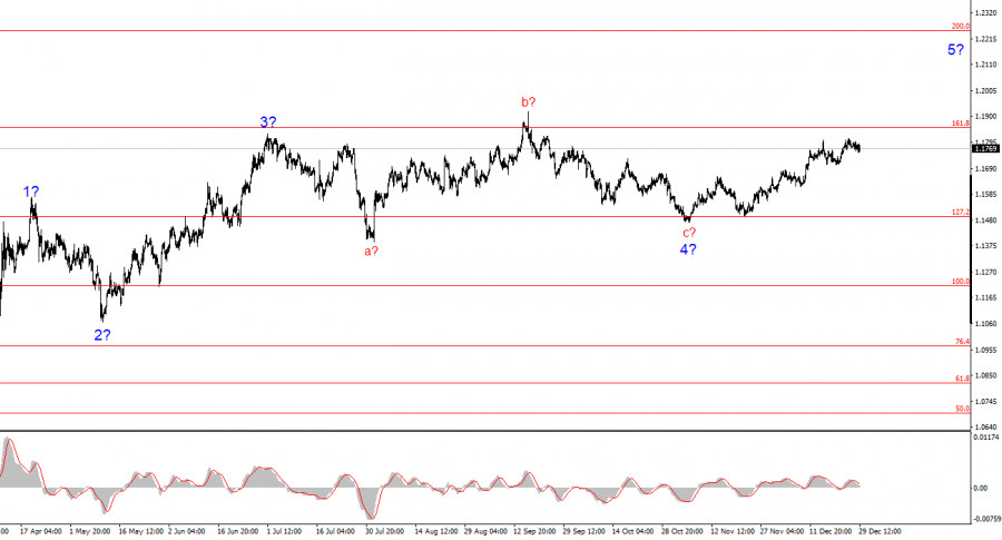 Волновая разметка 4-часового графика для инструмента EUR/USD имеет вполне понятный, хоть и довольно сложный вид. Об отмене повышательного участка тренда, который берет свое начало в январе 2025 года, речи не идет, но волновая структура, начиная с 1 июля, приняла сложный и протяженный вид. На мой взгляд, инструмент завершил построение коррекционной волны 4, которая приняла очень нестандартный вид. Внутри этой волны мы наблюдали исключительно коррекционные структуры, поэтому сомнений в коррекционном характере этой волны не возникает никаких. На мой взгляд, построение повышательного участка тренда не завершено, а его цели разбросаны вплоть до 25-й фигуры. Серия волн a-b-c-d-e выглядит завершенно, следовательно, я в ближайшие недели ожидаю построения нового повышательного набора волн. Мы увидели предполагаемые волны 1 и 2, а сейчас инструмент находится в стадии построения волны 3 или с. Эта волна принимает достаточно протяженный вид, что очень хорошо, так как в этом случае она может получиться импульсной. А вместе с ней – и весь повышательный набор волн.