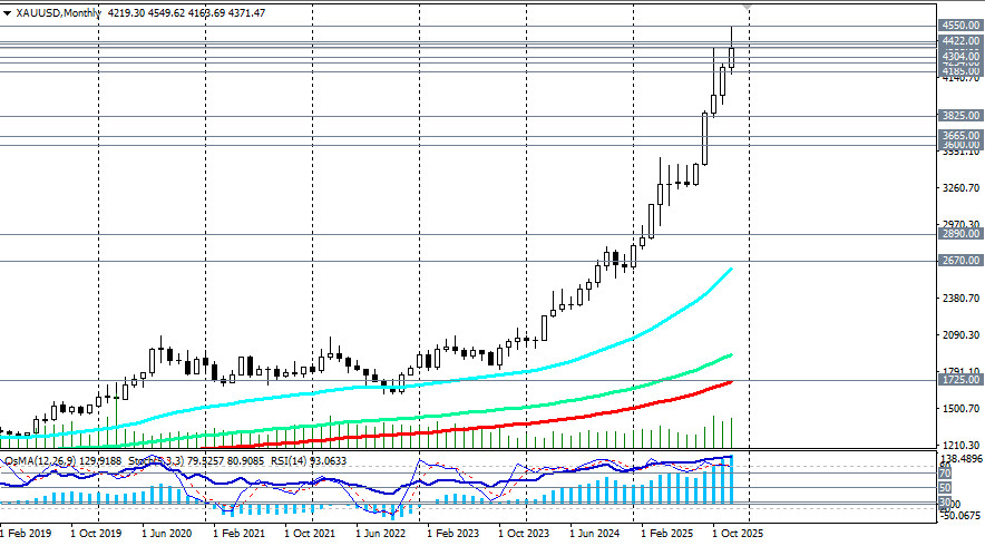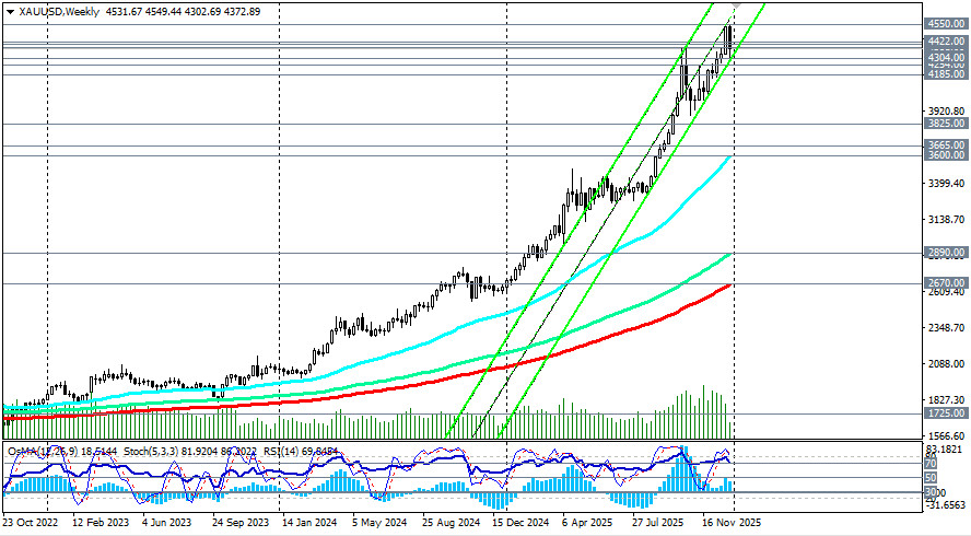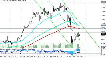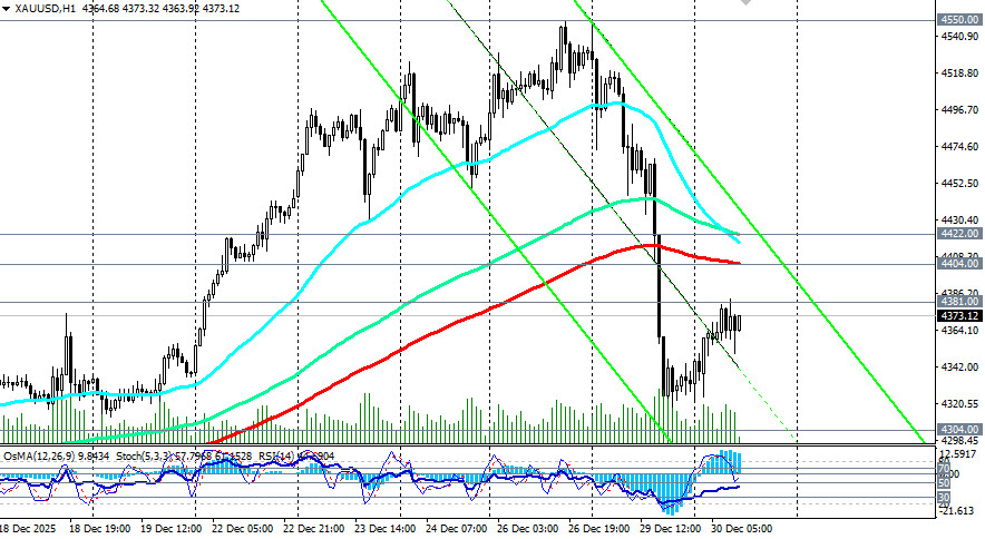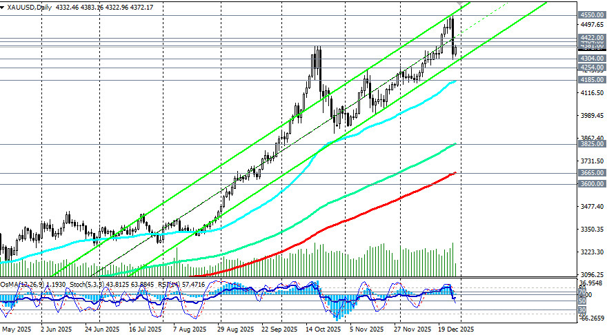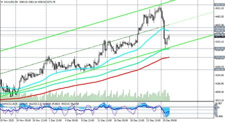 После вчерашнего обвала на фоне широкой фиксации прибыли и перераспределению позиций сегодня пара XAU/USD восстанавливается, понемногу отыгрывая вчерашнее падение. На текущий момент и в начале американской торговой сессии XAU/USD торгуется вблизи отметки 4381.00, тестируя максимумы октября на пробой. В то же время, активность остаётся низкой: большинство инвесторов готовятся к новогодним торгам и не спешат открывать новые позиции, отметили мы в нашем сегодняшнем фундаментальном анализе и обзоре «XAU/USD: фиксация прибыли и коррекция рынка драгметаллов». Если рост цены продолжится, то ближайшей целью станет зона сопротивления вокруг уровней 4400.00, 4404.00 (ЕМА200 на 1-часовом графике). Ее прорыв и пробой уровня сопротивления вокруг 4422.00 (ЕМА144 на 1-часовом графике) подтвердит восстановление бычьего импульса, создав предпосылки для дальнейшего роста. Ближайшими целями после этого станут «круглая» отметка 4500.00 и недавние рекордные максимумы, достигнутые вблизи отметки 4550.00. Данный рост подтвердит сохранение потенциала и для дальнейшего роста: ожидания дальнейшего смягчения денежно-кредитной политики ФРС и глобальная неопределённость, сохраняющая спрос на традиционные убежища, поддерживают эти перспективы. В альтернативном сценарии цена не сможет преодолеть зону сопротивления 4400.00 – 4404.00. Вблизи этих отметок произойдёт отбой, и у медведей появится новая возможность «протолкнуть» цены ниже вчерашних минимумов и отметки 4303.00, к уровням поддержки 4254.00 (200-периодная скользящая средняя на 4-часовом графике), 4200.00 и даже – к 4185.00 (ЕМА50 на дневном графике). Однако данное падение создаст, в свою очередь, новую возможность для входа в длинные позиции по более выгодным ценам. В любом случае актуальными в долгосрочном периоде остаются длинные позиции, также учитывая благоприятный для цен на золото фундаментальный фон и показания технических индикаторов (в нашем случае это – RSI, OsMA, Стохастик), которые на недельном и месячном графиках сигнализируют о сохранении потенциала для дальнейшего роста, долгое время оставаясь в зоне перекупленности, подтверждая тем самым сильный бычий импульс. открыть торговый счет + зарегистрироваться в системе копирования сигналов + инвестировать в ПАММ-системеМатериал предоставлен компанией InstaForex - www.instaforex.com