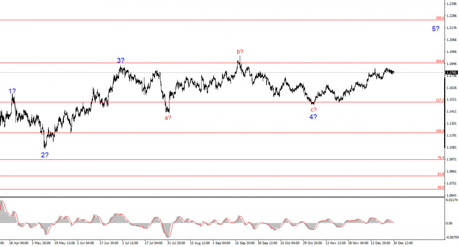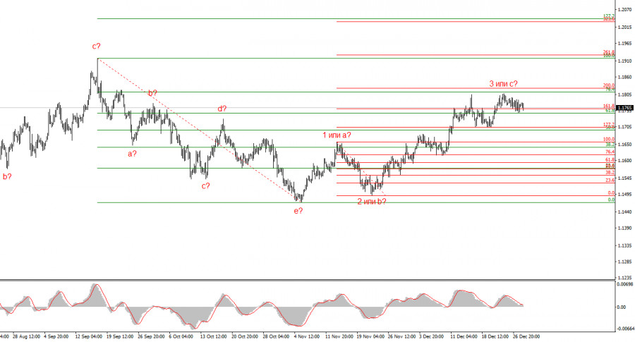 Курс инструмента EUR/USD в течение вторника практически не изменился. Амплитуда движений на рынке остается низкой, рынок готовится к Новому году. На этой неделе остается лишь два рабочих дня, и я сильно сомневаюсь, что кто-либо из участников рынка будет активно открывать торговые сделки 31 декабря или 2 января. При полном отстутствии новостного фона. 2025-й год заканчивается, и как итого можно сказать только одно: доллар продемонстрировал рекордную слабость, теряя позиции практически против всех существующих валют в мире. Политика Дональда Трамп нанесла сокрушительный удар по доллару, но в Белом доме только рады этому, так как видят в слабой валюте решение проблемы с низким экспортом и отрицательным торговым балансом. Поэтому я не сомневаюсь, что снижение стоимости доллара продолжится и в 2026 году. Однако доллару следует опасаться не только политики Трампа, но и политики FOMC. На декабрьском заседании комитет FOMC продемонстрировал готовность понизить процентную ставку в 2026 году один раз(согласно графику «dot-plot»). Однако многие участники рынка и экономисты уже сейчас уверены, что раундов смягчения будет не менее трех. Рынок труда остается слабым, Трамп продолжает требовать снижения ставки минимум на 100 базисных пунктов, Джером Пауэлл покидает свой пост, а инфляция, вопреки ожиданиям рынка, замедлилась по итогам ноября. Следовательно, у ФРС есть всё необходимое, чтобы не откладывать новое смягчение в долгий ящик. Рынок это понимает, и может уже в январе продолжить распродажи американской валюты, так как перспективы доллара на 2026 год остаются негативными.Общие выводы.