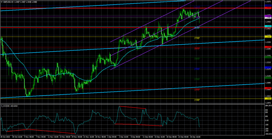 Валютная пара GBP/USD во вторник продолжала торговаться в ограниченном ценовом диапазоне. Фунт стерлингов в последнее время не грешил флэтом, но праздничная неделя – есть праздничная неделя. С 23 декабря цена находится между уровнями 1,3474 и 1,3533 и не собирается покидать этот диапазон пока не пробьют куранты. Таким образом, мы не ждем сильных, трендовых движений ни сегодня, ни в пятницу. По британской валюте сохраняется восходящая тенденция, что отлично видно на 4-часовом ТФ, на дневном ТФ и даже на недельном ТФ. Многие аналитики в данное время сомневаются в способности британского фунта продолжить рост в 2026 году. Мы бы хотели их немного успокоить. Во-первых, следует помнить, что мы не выступаем против нисходящего тренда и любого укрепления американкой валюты. Если тренд(локальный или глобальный) начнет меняться, а также появятся факторы поддержки для доллара, мы первые укажем на то, что следует ожидать рост американской валюты. Однако в том то и дело, что тренд не меняется, а факторов роста у доллара нет. С большой натяжкой можно занести к актив доллару фактор смягчения монетарной политики Банка Англии в 2026 году. Однако напомним, что во второй половине 2025 года доллар явно подорожал сильнее, чем того заслуживал. Мы не раз обращали внимание на тот факт, что фунт падает по поводу и без этой осенью. Поэтому мы считаем столь сильное падение пары алогичным и несправедливым. Однако сейчас цена закрепилась выше линии Сенкоу Спан Б на дневном ТФ, а пара EUR/USD выступает для фунта поддерживающим инструментом. Поясним. Евро и фунт исторически демонстрируют высокую степень корреляции. Падение евро крайне редко не сопровождается падением фунта. И наоборот. Так как евровалюта находится на грани выхода из бокового канала и возобновления восходящего тренда, представить себе падение фунта в 2026 году крайне тяжело. У фунта же имеются и свои собственные факторы роста. Во второй половине мы увидели просто классическую коррекцию на три волны, поэтому с высокой долей вероятности она завершена. Банк Англии хоть и собирается продолжать смягчение монетарной политики, все же не конкурент ФРС. Хотим напомнить, что монетарная политика ФРС гораздо важнее политики БА. Доллар остается мировой резервной валютой, поэтому от позиции и политики ФРС зависит судьба «тихой гавани» и «самого безопасного актива». В последние годы доллар теряет свой «безопасный статус», а глобальный тренд мог смениться еще в 2022 году, когда фунт проседал почти до ценового паритета с долларом. Ни один тренд – не вечен. А с приходом Дональда Трампа, которому абсолютно не нужен дорогой доллар, вероятность падения американской валюты резко возросла. Что мы имеем по итогу? Пара GBP/USD уже три года находится в восходящем тренде, а Дональд Трамп делает все, чтобы доллар и дальше только снижался. Средняя волатильность пары GBP/USD за последние 5 торговых дней составляет 57 пунктов. Для пары фунт/доллар это значение является «средне-низким». В среду, 31 декабря, таким образом, мы ожидаем движения внутри диапазона, ограниченного уровнями 1,3423 и 1,3537. Старший канал линейной регрессии развернулся вверх, что указывает на восстановление тренда. Индикатор CCI шесть раз заходил в область перепроданности за последние месяцы и сформировал множество «бычьих» дивергенций, что постоянно предупреждало о возобновлении восх