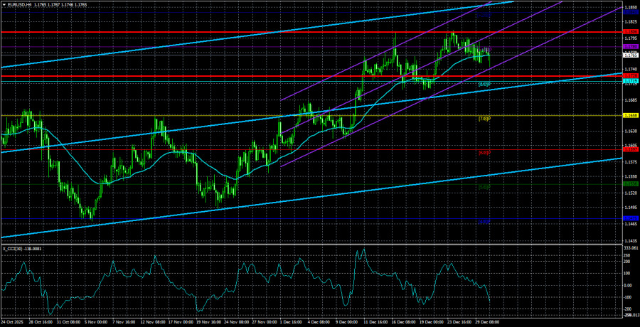 Валютная пара EUR/USD в течение вторника продолжала торговаться в праздничном стиле. Движений на рынке практически нет, фундаментальный и макроэкономический фон отсутствует, уже сегодня рынок закроется, а четверг – выходной день. Таким образом, текущая неделя действительно обладает статусом «праздничная». Не удивительно, что трейдеры абсолютно не спешат открывать новые сделки и больше думают об оливье и шампанском, а не о перспективах пары EUR/USD до конца года. Мы полностью поддерживаем такой вариант, так как отдыхать тоже нужно. Год получился насыщенным, отдых заслужили все. Опасения в отношении «тонкого» рынка и «полетов» на новогодние праздники не подтвердились, что тоже очень хорошо. Нас даже немного удивляет тот факт, что некоторые аналитики пытаются анализировать текущие «конвульсии» рынка и давать какие-то прогнозы. На рынке сейчас царит тотальный флэт. На дневном ТФ он продолжается уже шесть месяцев, и не будет лишним напомнить, что флэт – это не случайное событие. Флэт – это период времени, когда маркет-мейкеры накапливают позиции для нового тренда или же распределяют свои позиции перед сменой тренда. Таким образом, флэт – это отличное время для... открытия новых позиций. Мы говорили, что около уровня 1,1400 следует ожидать разворот вверх. До уровня 1,1400 цена добраться не сумела, но все же развернулась около него. Сейчас она уже несколько недель торгуется около верхней границы бокового канала 1,1400-1,1830, поэтому мы практически не сомневаемся – в начале нового года произойдет прорыв. На младших графиках – тоже флэт. При чем, можно даже сказать, что начался он 12 декабря. Напомним, что в течение недели 15-19 декабря в Штатах было опубликовано огромное количество важной информации, а в Евросоюзе и Великобритании состоялись важные заседания центральных банков. И вся эта информация оказалась недостойной отработки трейдерами. Начиная с 23 декабря мы наблюдаем еще один флэт – между уровнями 1,1750 и 1,1809. Таким образом, анализировать, по сути, нечего. В конце года рынок явно не желает форсировать события. Что касается перспектив пары EUR/USD, то наша позиция остается неизменной – доллар будет падать и в 2026 году. Никаких фундаментальных оснований для его роста в среднесрочной перспективе нет. За всю вторую половину 2025 года доллар не сумел скорректироваться против евро больше, чем на 23,6%. Да и то, эта коррекция стала возможной благодаря флэту. ЕЦБ на следующий год не планирует ни одного раунда смягчения монетарной политики, а ФРС наверняка проведет снижение ключевой ставки и, возможно, даже не одно. Помимо этого, не стоит сбрасывать со счетов «фактор Трампа», слабость американского рынка труда, падение инфляции в США и смену председателя правления ФРС в мае. Все эти факторы будут подталкивать доллар к новому падению. Средняя волатильность валютной пары EUR/USD за последние 5 торговых дней по состоянию на 31 декабря составляет 39 пунктов и характеризуется, как «низкая». Мы ожидаем движение пары между уровнями 1,1728 и 1,1806 в среду. Старший канал линейной регрессии разворачивается вверх, но по факту все еще продолжается флэт на дневном ТФ. Индикатор CCI заходил в октябре в область перепроданности дважды(!!!), но в начале декабря посетил область перекупленности. Небольшой откат мы уже увидели. Ближайшие уровни поддержки: S1 – 1,1719 S2 – 1,1658 S3 – 1,1597 Ближайшие уровн