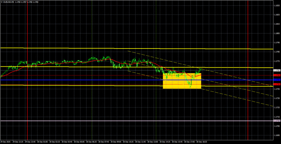 Валютная пара EUR/USD во вторник продолжала торговаться с минимальной волатильностью. Во всем мире продолжаются рождественские и новогодние праздники, поэтому движений на валютном рынке практически нет. Макроэкономический и фундаментальный фон отсутствуют. Таким образом, до конца года вряд ли стоит ожидать сильных и трендовых движений. На этой неделе календарь событий Евросоюза и США абсолютно пустой. В техническом плане на часовом ТФ сохраняется восходящая тенденция, несмотря на пробой линия тренда. Линия тренда пробита, но ниже области 1,1750-1,1760 и критической линии цене закрепиться не удалось. Поэтому восходящая тенденция сохраняется. Однако, рассчитывать на более сильные и интересные движения можно будет лишь на следующей неделе, когда рынок полностью насладиться праздниками и выходными. На 5-минутном ТФ во вторник был сформирован один торговый сигнал, но о его качестве можете судить сами. Цена отскочила от области 1,1750-1,1760 только для того, чтобы не пройти вверх ни одного пункта. Формально никакого отскока и не было. Может быть, он случится сегодня, но даже на 20-30 пунктов движения в нужном направлении рассчитывать сейчас довольно тяжело.Советуем ознакомиться с другими статьями автора: