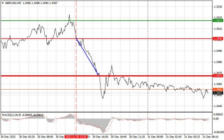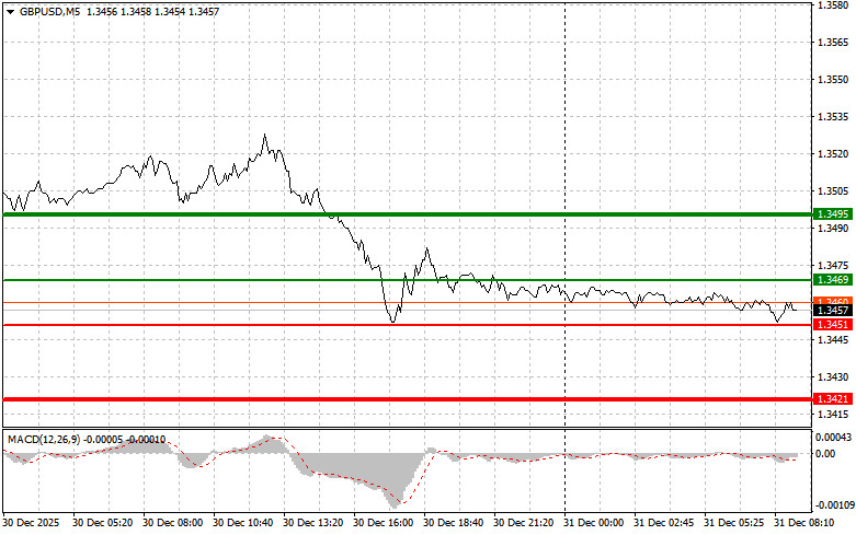 Разбор сделок и советы по торговле британским фунтомТест цены 1.3506 пришелся на момент, когда индикатор MACD только начинали движение вниз от нулевой отметки, что стало подтверждением правильной точки входа на продажу фунта. В результате пара снизилась на 30 пунктов. Хорошие данные по росту индекса цен на жилье в США и индекса PMI Чикаго оказали вчера сильную поддержку американскому доллару в паре с британским фунтом. Опубликованные данные укрепили уверенность инвесторов в устойчивости американской экономики, невзирая на продолжающиеся дискуссии о возможном замедлении экономического роста. Индекс цен на жилье, продемонстрировавший неожиданно высокий рост, указал на сохраняющийся спрос на недвижимость, что является важным индикатором общего экономического здоровья страны. В свою очередь, индекс PMI Чикаго, отразивший улучшение деловой активности в производственном секторе региона, подтвердил, что промышленность США продолжает адаптироваться к меняющимся условиям и демонстрирует признаки восстановления.Учитывая сегодня отсутствие важной фундаментальной статистики по Великобритании, весь акцент смещен на технический анализ. Это означает, что участники рынка будут пристально следить за движением котировок, графическими моделями и уровнями поддержки и сопротивления, пытаясь спрогнозировать дальнейшую динамику британского фунта. В таких условиях особую роль приобретают краткосрочные стратегии и умение быстро реагировать на изменения рыночных настроений. Трейдеры, использующие технический анализ, будут ориентироваться на индикаторы, такие как RSI, MACD и Stochastic Oscillator, для определения потенциальных точек входа и выхода из позиций. Однако, не стоит забывать, что даже самый совершенный технический анализ не может полностью исключить влияние неожиданных новостных событий или геополитических факторов. В любой момент может появиться информация, способная кардинально изменить расстановку сил на рынке и свести на нет все предыдущие прогнозы.Что касается внутридневной стратегии, то больше буду опираться на реализацию сценариев №1 №2.Сценарии на покупкуСценарий №1: покупать фунт сегодня планирую при достижении точки входа в районе 1.3469 (зеленая линия на графике) с целью роста к уровню 1.3495 (более толстая зеленая линия на графике). В районе 1.3495 собираюсь выходить из покупок и открывать продажи в обратную сторону (расчет на движение в 30-35 пунктов в обратную сторону от уровня). Рассчитывать на сильный рост фунта сегодня вряд ли возможно. Важно! Перед покупкой, убедитесь в том, что индикатор MACD находится выше нулевой отметки и только начинает свой рост от нее.Сценарий №2: покупать фунт сегодня также планирую в случае двух подряд тестов цены 1.3451 в момент, когда индикатор MACD будет находиться в области перепроданности. Это ограничит нисходящий потенциал пары и приведет к обратному развороту рынка вверх. Можно ожидать рост к противоположным уровням 1.3469 и 1.3495.Сценарии на продажу Сценарий №1: продавать фунт сегодня планирую после обновления уровня 1.3451 (красная линия на графике), что приведет к быстрому снижению пары. Ключевой целью продавцов будет уровень 1.3421, где собираюсь выходить из продаж, а также открывать сразу покупки в обратную сторону (расчет на движение в 20-25 пунктов в обратную сторону от уровня). Продавцы фунта могут себя проя