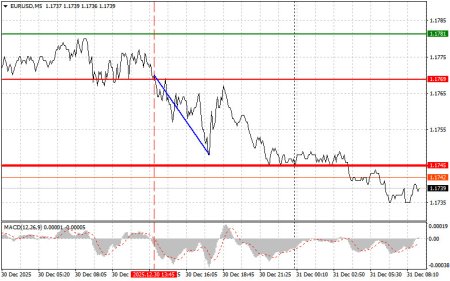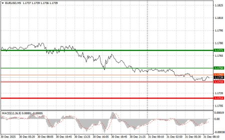 Разбор сделок и советы по торговле европейской валютойТест цены 1.1769 пришелся на момент, когда индикатор MACD только начинал движение вниз от нулевой отметки, что стало подтверждением правильной точки входа на продажу евро. В результате пара снизилась на 20 пунктов.Несомненно, укрепление доллара США, подкрепленное позитивными отчетами о подъеме цен на недвижимость и индексе деловой активности в Чикаго, оказало существенное влияние на текущие тренды валютных торгов. Однако конец года, сохраняющаяся неуверенность в темпах экономического развития США, геополитические напряжения и потенциальные сдвиги в стратегиях центробанков могут вновь создать давление на американскую валюту уже в следующем году. Вчерашний протокол декабрьского заседания ФРС показал, что политики не собираются полностью отказываться от идеи дальнейшего снижения процентных ставок, что будет и дальше оказывать давление на доллар в среднесрочной перспективе. Сегодня европейская валюта, вероятно, останется под давлением, поскольку в первой половине дня публикация экономических данных по еврозоне не запланирована. В отсутствие новых цифр, отражающих состояние экономики региона, инвесторы будут вынуждены опираться на ранее заданную траекторию. Отсутствие статистических релизов может спровоцировать очередное укрепление позиций доллара в конце года.Что касается внутридневной стратегии, то больше буду опираться на реализацию сценариев №1 и №2.Сценарии на покупкуСценарий №1: сегодня покупать евро можно при достижении цены в районе 1.1750 (зеленая линия на графике) с целью роста к уровню 1.1771. В точке 1.1771 планирую выходить из рынка, а также продавать евро в обратную сторону в расчете на движение в 30-35 пунктов от точки входа. Рассчитывать на рост евро можно только в рамках небольшой коррекции. Важно! Перед покупкой, убедитесь в том, что индикатор MACD находится выше нулевой отметки и только начинает свой рост от нее.Сценарий №2: покупать евро сегодня также собираюсь в случае двух подряд тестов цены 1.1733 в момент, когда индикатор MACD будет находиться в области перепроданности. Это ограничит нисходящий потенциал пары и приведет к обратному развороту рынка вверх. Можно ожидать рост к противоположным уровням 1.1750 и 1.1771.Сценарии на продажуСценарий №1: продавать евро планирую после достижения уровня 1.1733 (красная линия на графике). Целью будет уровень 1.1714, где собираюсь выходить из рынка и покупать сразу в обратную сторону (расчет на движение в 20-25 пунктов в обратную сторону от уровня). Небольшое давление на пару сегодня может быть заметно в первой половине дня. Важно! Перед продажей, убедитесь в том, что индикатор MACD находится ниже нулевой отметки и только начинает свое снижение от нее.Сценарий №2: продавать евро сегодня также собираюсь в случае двух подряд тестов цены 1.1750 в момент, когда индикатор MACD будет находиться в области перекупленности. Это ограничит восходящий потенциал пары и приведет к обратному развороту рынка вниз. Можно ожидать снижения к противоположному уровню 1.1733 и 1.1714.Что на графике:Тонкая зеленая линия – цена входа, по которой можно покупать торговый инструмент;Толстая зеленая линия – предположительная цена, где можно расставлять Take Profit или самостоятельно фиксировать прибыль, так как выше этого уровня дальнейший рост маловероятен;Тонкая красная л