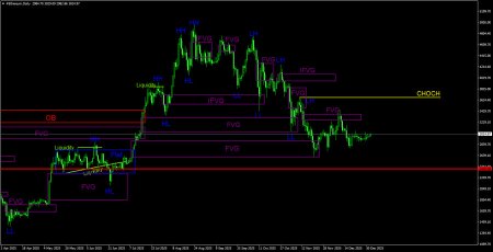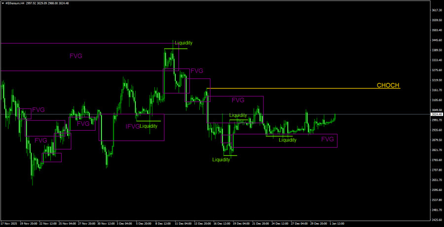 Эфир на дневном ТФ продолжает формирование нисходящей тенденции. В последние несколько недель цена стоит на одном месте, но ранее был отработан очередной «медвежий» FVG, который дал новый сигнал на продажу. Новых паттернов в последнее время не формировалось. Линия CHOCH проходит по уровню 3 666$ – последний LH(Lower High). До тех пор, пока цена находится ниже нее, нисходящий тренд сохраняется. Восходящая коррекция могла уже завершиться, так как эфир достиг свой единственный неотработанный «медвежий» FVG и получил недвусмысленную реакцию с подтверждением на младшем ТФ. Но сейчас на рынке – рождественская/новогодняя пауза.Анализ ETH/USD 4Н.