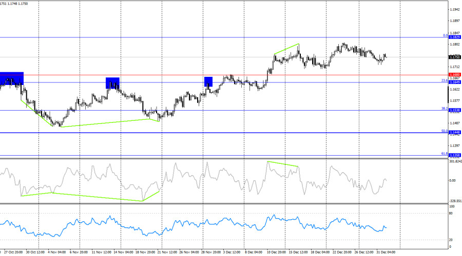 Ситуация с волнами на часовом графике остается простой. Последняя завершенная волна вверх не пробила пик предыдущей волны, а новая волна вниз пока не пробила предыдущий лоу. Таким образом, тренд официально остается «бычьим». Назвать его сильным язык не поворачивается, но в последние недели быки воспряли духом, а затем начались праздники. Смягчение ДКП ФРС будет оказывать давление на доллар в 2026, а ЕЦБ не создаст никаких проблем евровалюте. «Бычий» тренд завершится в случае закрепления пары под уровнем 1,1718 и последними тремя лоу. В среду информационный фон в США и Евросоюзе по-прежнему отсутствовал, а вся прошлая неделя и текущая неделя – больше праздничные, чем рабочие. В преддверии Нового года трейдеры-быки перестали атаковать и дали возможность медведям проявить инициативу. Впрочем, медведи также не спешат атаковать, предпочитая дождаться следующей недели, когда из США и Евросоюза начнет поступать экономическая информация. Напомню, что ключевыми вопросами для трейдеров остаются рынок труда США, безработица и инфляция. Для того, чтобы трейдеры-быки продолжали очередное наступление, эти отчеты должны и дальше демонстрировать слабые значения. Комитет FOMC трижды понизил процентную ставку, но хватит ли этого для восстановления рынка труда – пока неясно. Доллар США по-прежнему не может рассчитывать на сильный рост против европейской валюты, но и быкам нужны новые причины для атак. Таким образом, на мой взгляд, нужно ждать следующей статистики.