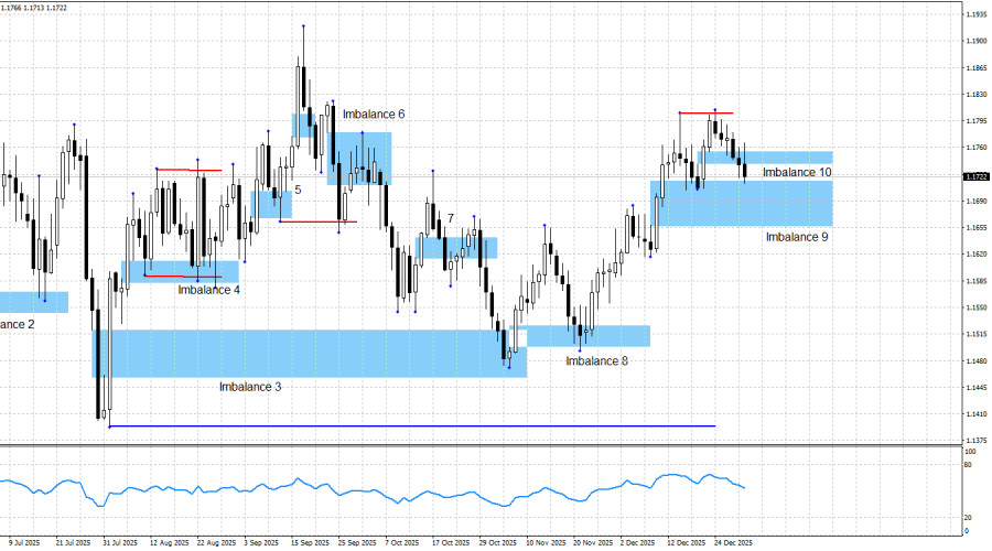 На прошлой неделе случился съем ликвидности со свинга от 16 декабря, что и послужило основанием для начала падения. Падение пока очень слабое, а съем ликвидности – это не паттерн, по нему нельзя открывать сделки и делать долгосрочные выводы. Падение пары может быть завершено уже на этой неделе, так как «бычьи» имбалансы 9 и 10 – это зоны поддержки для цены. Цена может получить вторую реакцию на имбаланс 9, может сделать это в совокупности со съемом ликвидности со свинга от 19 декабря. Графическая картина продолжает сигнализировать о «бычьей» доминации. «Бычий» тренд сохраняется, реакция на «бычий» имбаланс 3 получена, реакция на «бычий» имбаланс 8 получена, реакция на «бычий» имбаланс 9 получена. Несмотря на довольно длительное падение европейской валюты, доллар так и не сумел сломать «бычий» тренд. На это у него было 5 месяцев и никакого результата добиться он не смог. В случае появления «медвежьих» паттернов или инвалидации «бычьих», стратегию можно будет скорректировать. Но на данный момент времени ничто не указывает на это. Информационный фон в пятницу отсутствовал, а активность трейдеров после Нового года минимальная. Причин у быков для нового наступления имеется в достатке уже три месяца, и все они сохраняют свою актуальность. Это и «голубиные» (в любом случае) перспективы ДКП FOMC, это и общая политика Дональда Трампа (которая не поменялась за последнее время), это и противостояние США с Китаем (где наступило лишь временное перемирие), это и акции протеста против Трампа (захлестнувшие Америку уже три раза в текущем году), это и слабость рынка труда, это и не радужные перспективы американской экономики (рецессия), это и «шатдаун» (который длился полтора месяца, но явно не был учтен трейдерами). Таким образом, дальнейший рост пары, на мой взгляд, будет полностью закономерным. Не следует также упускать из виду торговую войну Трампа и его давление на FOMC. В последнее время новые тарифы вводятся редко, а сам Трамп перестал критиковать ФРС. Но лично я считаю, что это очередное «временное затишье». В последние месяцы FOMC проводит смягчение ДКП, поэтому и нового потока критики от Трампа не поступает. Однако это не означает, что эти факторы больше не создают проблем доллару. В «медвежий» тренд я по-прежнему не верю. Информационный фон по-прежнему крайне сложно интерпретировать в пользу доллара, поэтому я и не пытаюсь это делать. Синяя линия показывает ценовой уровень, ниже которого можно будет считать «бычий» тренд завершенным. До него медведям нужно пройти вниз около 400 пипсов, и я считаю эту задачу невыполнимой при текущем информационном фоне и в текущих обстоятельствах. Ближайшей целью для роста европейской валюты остается «медвежий» имбаланс 1,1976–1,2092 на недельном графике, который был образован еще в июне 2021 года. Календарь новостей для США и Евросоюза: США – Индекс деловой активности в секторе производства ISM (15-00 UTC). 5 января календарь экономических событий содержит в себе одну важную запись. Влияние информационного фона на настроение рынка в понедельник будет присутствовать во второй половине дня. Прогноз по EUR/USD и советы трейдерам: На мой взгляд, пара может находиться на завершающем этапе «бычьего» тренда. Несмотря на то, что информационный фон остается на стороне быков, атаковали в последние месяцы чаще медведи. Но все же реалистичн
