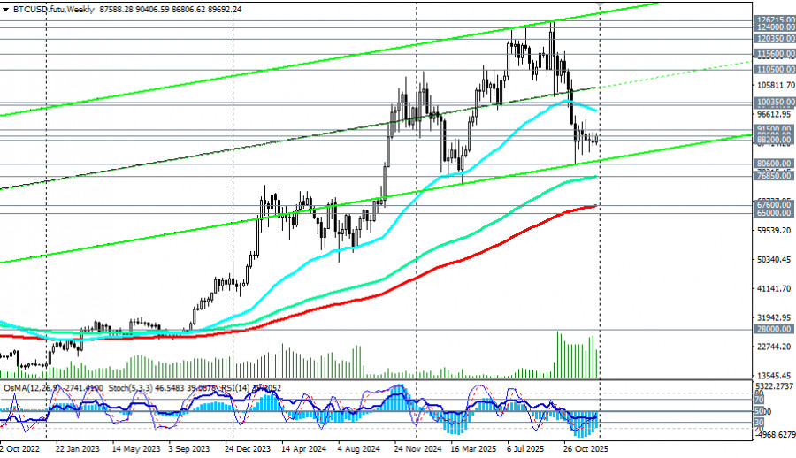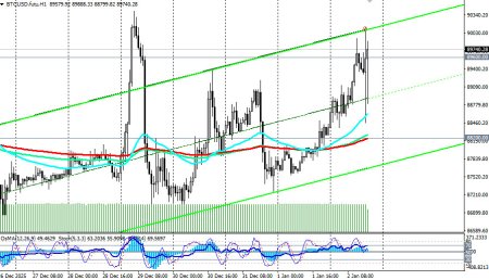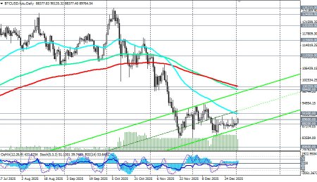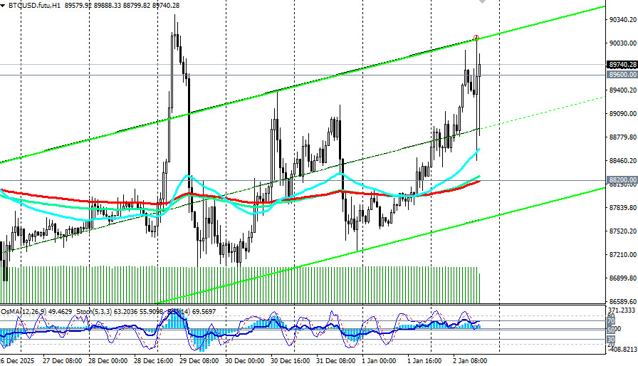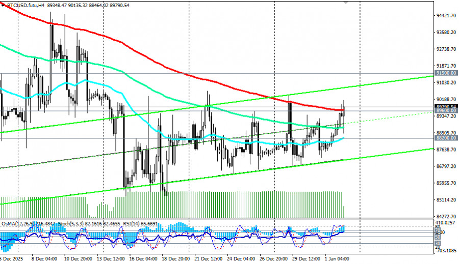 Несмотря на начальное торжественное настроение благодаря политике администрации Дональда Трампа, ситуация на крипторынке резко изменилась в конце года, характеризуя 4-й квартал отсутствием значимых прорывов и давлением негативных факторов. 2025 год биткоин завершил не так радужно, как предполагалось участниками рынка. На текущий момент BTC/USD торгуется вблизи отметки 89600.00, пытаясь закрепиться в зоне краткосрочного бычьего рынка выше уровня поддержки 88200.00 (ЕМА200 на 1-часовом графике). Для более успешного развития краткосрочной восходящей динамики цене все же необходимо также преодолеть сопротивление на уровне 89600.00 (ЕМА200 на 4-часовом графике). Учитывая осторожные настроения инвесторов (индекс «страха и жадности» сегодня находится на границе нейтральной зоны и зоны страха (и на отметке 44 из 100), в основном сценарии ожидаем возобновление снижения. Первым же сигналом здесь может стать пробой сегодняшнего минимума 88680.00 и уровня поддержки 88200.00, а целью снижения - зона поддержки вокруг уровней 80600.00 (минимумы ноября) и 76850.00 (минимумы марта и ЕМА144 на недельном графике). В альтернативном сценарии, после пробоя уровня сопротивления 89600.00 и закрепления выше отметки 90000.00 коррекция может продолжиться к важному уровню сопротивления 91500.00 (ЕМА50 на недельном графике). Дальнейший же рост и пробой «психологической» отметки 100000.00 и ключевого среднесрочного уровня сопротивления 100350.00 (ЕМА200 на дневном графике) подтвердит возрождение восходящей динамики. В текущей ситуации предпочтительными являются короткие позиции. В то же время, несмотря на нынешнюю неопределенность, долгосрочные перспективы остаются положительными при условии продолжения благоприятной регуляционной среды и восстановления экономического фона. Уровни поддержки: 88700.00, 88200.00, 86000.00, 85000.00, 81000.00, 80600.00, 77000.00, 76850.00, 68000.00, 67600.00, 65000.00 Уровни сопротивления: 89600.00, 90000.00, 91500.00, 94000.00, 97000.00, 97500.00, 99400.00, 100000.00, 100350.00, 104000.00, 110500.00, 115600.00, 120350.00, 124000.00, 126000.00 Торговые сценарии