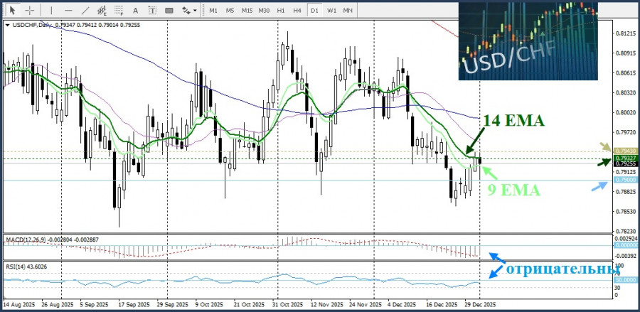 А с технической точки зрения, осцилляторы на дневном графике отрицательны. 9-дневная ЕМА проходит ниже 14-дневной ЕМА, что тоже подтверждает негативный прогноз для пары USD/CHF.
