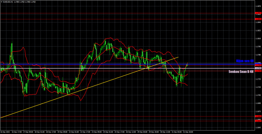 Валютная пара EUR/USD в среду продолжала торговаться с минимальной волатильностью, что абсолютно не удивительно, ведь это было 31-е декабря... Нам сложно даже предположить, кто открывал сделки 31 декабря, особенно во второй половине дня, поэтому весь день приобретает достаточно формальный и стопроцентно праздничный статус. Тем не менее, нельзя не отметить, что пара EUR/USD закрепилась на часовом ТФ ниже восходящей линии тренда, а также ниже линий индикатора Ишимоку. Мы считаем, что к праздничным движениям не стоит относится слишком серьезно. Уже сегодня цена может закрепиться выше линий Киджун-сен и Сенкоу Спан Б, что будет означать возобновление восходящей тенденции. Макроэкономический и фундаментальный фон отсутствовал, а новости в распоряжение трейдеров начнут поступать уже в понедельник, 5 января. На 5-минутном ТФ в пятницу был сформирован один торговый сигнал на продажу. На американской торговой сессии, за несколько часов до закрытия рынка цена отскочила снизу от области 1,1750-1,1760 и линии Киджун-сен. После этого пара прошла в нужном направлении около 20 пунктов, которые и можно было заработать, если кто-то открывал позиции за несколько часов до Нового года...Советуем ознакомиться с другими статьями автора: