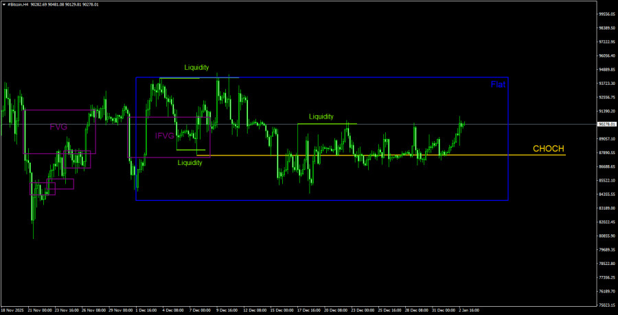 На 4-часовом таймфрейме техническая картина также однозначно указывает на нисходящий тренд, а цена все еще находится в боковом канале. Линия CHOCH(слом тренда), которая проходила на уровне 87 600$, преодолена, а значит краткосрочная восходящая тенденция сломлена. Однако внутри флэта локальные тенденции не имеют значения. В ближайшее время трейдеры могут вести торговлю только от границ бокового канала. При чем, сигналы на продажу, с нашей точки зрения, гораздо более привлекательные, чем сигналы на покупку. Формально два сигнала на продажу уже было сформировано. Но эти сигналы можно считать отработанным, так как с даты их формирования прошло больше двух недель. 18 декабря цена подходила вплотную к нижней линии канала.Рекомендации по торговле BTC/USD: