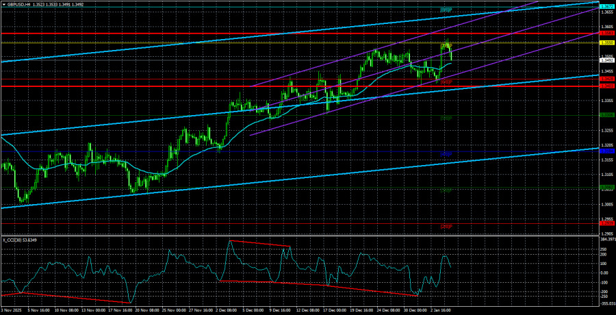 Валютная пара GBP/USD во вторник продолжала торговаться очень спокойно и около своих локальных максимумов. На арест Мадуро трейдеры GBP/USD не обратили никакого внимания. По сути, они были правы, так как никакого геополитического конфликта нет. А как Трамп собирается управлять другим суверенным государством, для многих остается непонятным. Мы уже говорили, что одно дело провести военную операцию в другой стране, другое дело – установить над ней полный контроль. Венесуэла – это не безлюдная пустошь, а оружие в ней имеет каждый первый житель. Таким образом, с нашей точки зрения, Трамп может договариваться с Родригес сколько угодно. Народ Венесуэлы не одобрит подобные сделки. Поэтому британский фунт в паре с долларом совершенно закономерно никак не отреагировал на это событие. А чуть позже в понедельник вышел индекс деловой активности ISM в производственном секторе, который показал, что рынок считает важным в данное время. Трамп может проводить военные операции, устанавливать мир, останавливать войны, но все его методы не приветствуются трейдерами и инвесторами. Экономика США показала чуть ли не рекордный рост в третьем квартале, но чем он подкреплен? Государственными расходами? Американская экономика растет не потому, что богатеет каждый ее отдельный гражданин. Богатеют в США только зажиточные американцы, а бедные – продолжают беднеть. Уровень безработицы растет, рынок труда находится в нокауте, деловая активность падает, ФРС вынуждена понижать ключевую ставку, промышленное производство не растет. Таким образом, мы, как и прежде, ожидаем только роста пары GBP/USD. В пользу этого говорят и фундаментальные, и технические факторы. Фундамент по-прежнему не дает ответа на вопрос, а за счет чего доллару вообще дорожать? Лишь фактор смягчения монетарной политики Банка Англии в 2026 году может оказывать некоторую поддержку доллару. Раньше доллар мог бы рассчитывать на поддержку рынка на фоне геополитических конфликтов, но сейчас центральные банки и крупные инвесторы стараются избавиться от американской валюты(о чем, кстати, красноречиво свидетельствуют отчеты COT). Таким образом, доллар уже не является «резервной валютой». С технической точки зрения, пара закрепилась выше облака Ишимоку на дневном ТФ, а нисходящая коррекция, которая заняла 4 полных месяца, с высокой долей вероятности завершена. Все указывает на то, что восходящий тренд 2025 года будет продолжен. А на недельном ТФ отлично видно, что глобальный восходящий тренд мог начаться еще в 2022 году, когда фунт опускался чуть ли не до ценового паритета с долларом. На этой неделе трейдерам еще предстоит ознакомиться с отчетами JOLTs, ADP, ISM, NonFarm Payrolls, потребительским доверием Мичиганского университета и уровнем безработицы. Таким образом, поводов у рынка распродавать американскую валюту до конца недели может появиться еще достаточно. Конечно, не стоит ожидать, что все американские отчеты провалятся. Однако вероятность слабых значений по большинству из них высока. В то же время в Великобритании важных событий на текущую неделю не запланировано. Средняя волатильность пары GBP/USD за последние 5 торговых дней составляет 90 пунктов. Для пары фунт/доллар это значение является «средним». В среду, 7 января, таким образом, мы ожидаем движения внутри диапазона, ограниченного уровнями 1,3403 и 1,3583. Старший кана