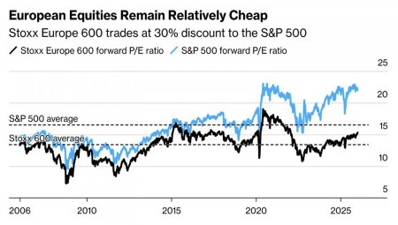 Goldman Sachs называет 2026 годом микроротации из-за экстремальной концентрации и развивающейся торговли технологиями искусственного интеллекта. По данным банка, на 10 крупнейших акций приходилось 41% капитализации и 53% доходности S&P 500 в 2025. При этом гиганты продолжают двигать рынок. Так, заявление NVIDIA о более оптимистичных взглядах на выручку позволили широкому фондовому индексу обновить рекорды. В октябре крупнейшая компания в мире прогнозировала выручку в размере около полутриллиона долларов. Несмотря на пропуск S&P 500 ралли Санта-Клауса, инвесторы с оптимизмом смотрят в будущее. Особенно на старт год. С 1929 в январе американский рынок акций рос в 60% случаев. Вместе с тем Goldman Sachs прогнозирует, что в новом году Европа вновь затмит Соединенные Штаты. Банк ожидает ралли EuroStoxx 600 к 625, что на 4% выше текущих уровней. Динамика P/E европейского и американского фондовых индексов