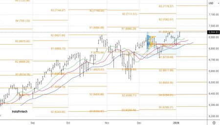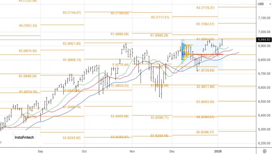 Вполне вероятно, S&P 500 в 2026 будет двигаться в режиме два шага вперед, один назад. Внешний фон выглядит не таким благоприятным, как ранее. Однако на рынке чаще гостит жадность, чем страх. Технически на дневном графике широкого фондового индекса имеет место восстановление восходящего тренда. Сформированные от 6840 и выше длинные позиции по S&P 500 имеет смысл удерживать и периодически наращивать. В качестве целевых ориентиров фигурируют отметки 7050 и 7150. Вместе с тем неспособность «быков» увести котировки выше сопротивления на 6980 станет признаком их слабости и активирует паттерн Три индейца. Материал предоставлен компанией InstaForex - www.instaforex.com