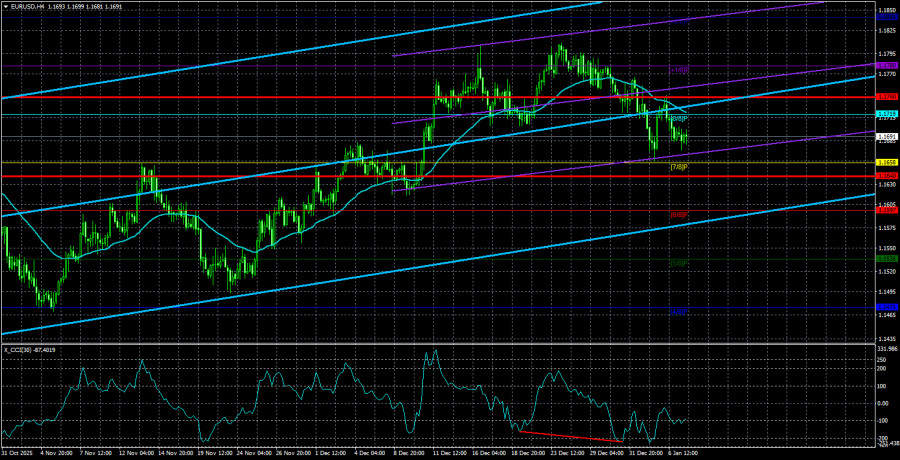 Валютная пара EUR/USD в течение среды сохраняла нисходящую тенденцию, но самое главное – с евровалюты было снято психологическое давление. Сутками ранее в Германии был опубликован отчет по инфляции за декабрь, и выяснилось, что потребительские цены замедлились до +1,8% в годовом выражении, хотя месяцем ранее прирост составил 2,3%. Мы говорили о том, что паниковать по этому поводу рано, лучше дождаться отчета по инфляции по всему Евросоюзу. Вчера соответствующий отчет вышел, и его значение в точности совпало с прогнозами – 2%. Почему для евровалюты опасно замедление инфляции? Все просто. Если инфляция продолжает снижаться ниже отметки 2%, это повод для ЕЦБ возобновить цикл смягчения монетарной политики. Напомним, что ранее некоторые представители Монетарного комитета ЕЦБ допускали, что в 2026 году регулятор один или несколько раз повысит ключевые ставки. Если инфляция снижается под целевой уровень ЕЦБ, то ни о каком ужесточении политики и речи идти не может. Именно на эту логическую цепочку и отреагировал рынок во вторник продажами евро. Но, как выяснилось в среду, тревога оказалась ложной, инфляция в ЕС остается ровно на целевой отметке. Таким образом, для пары EUR/USD на первом месте продолжают находиться данные по рынку труда, безработице и инфляции в США. Именно они определят будущие решения ФРС по монетарной политике. В среду было опубликовано несколько отчетов по этим показателям, но мы предпочитаем делать выводы на основании NonFarm Payrolls и уровня безработицы, которые выйдут в пятницу. Вчерашние отчеты ADP, JOLTs и ISM, конечно, важны, и реакцию рынка они спровоцировали. Однако локальные отчеты, не влияющие на монетарную политику ФРС, вряд ли способны привести к завершению флэта на дневном ТФ. Да, пара EUR/USD все еще торгуется между уровнями 1,1400 и 1,1830. Уже шесть месяцев подряд. Сколько еще она проведет времени в этом диапазоне – сложно сказать. Год начался достаточно бурно, с военной операции Трампа в Венесуэле. Однако как показали последующие несколько дней, рынок не оценил старания Трампа по попытке захвата нефтяных месторождений Венесуэлы под эгидой борьбы с наркотраффиком. Рынок также не верит, что Трамп проведет аналогичные операции на Кубе, в Колумбии или на острове Гренландия, принадлежащему Дании, которая является членом Европейского союза. Таким образом, блицкриг Трампа получился очень эффектным, но дальше все может проходить по правилу «Trump always chickens out». Вероятно, американский президент рассчитывал убить двух зайцев одним выстрелом – свергнуть режим Мадуро в Венесуэле и показать всему миру, что с ним шутки плохи. Первая часть плана была выполнена на «5+», за вторую пока можно поставить «троечку». Средняя волатильность валютной пары EUR/USD за последние 5 торговых дней по состоянию на 7 января составляет 50 пунктов и характеризуется, как «средне-низкая». Мы ожидаем движение пары между уровнями 1,1640 и 1,1740 в четверг. Старший канал линейной регрессии направлен вверх, но по факту все еще продолжается флэт на дневном ТФ. Индикатор CCI заходил в начале декабря в область перекупленности, но небольшой откат мы уже увидели. На прошлой неделе была сформирована «бычья» дивергенция, которая указывает на возобновление восходящего тренда. Ближайшие уровни поддержки: S1 – 1,1658 S2 – 1,1597 S3 – 1,1536 Ближайшие уровни сопротивления: R1 – 1,1719 R2 – 1,1780 R3 – 1,1841 Советуем о