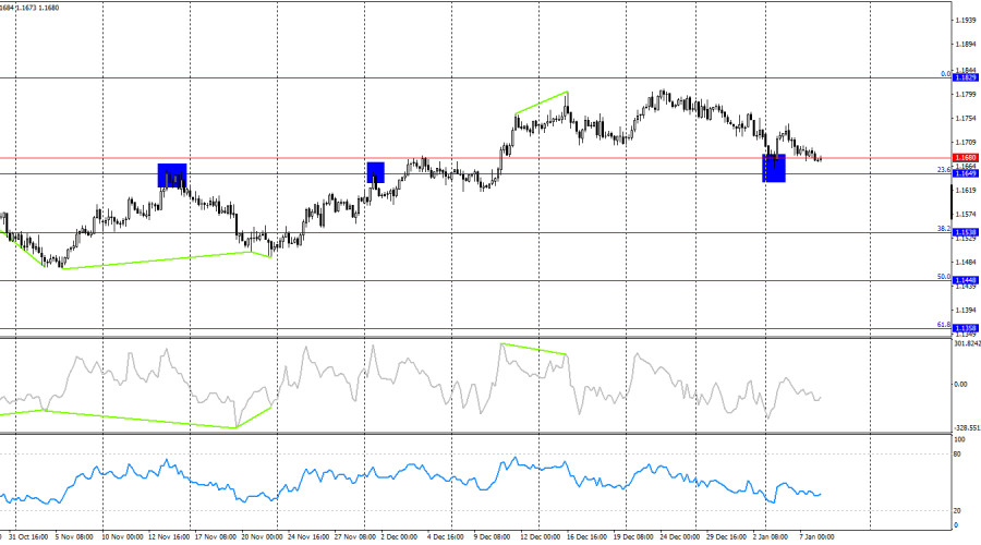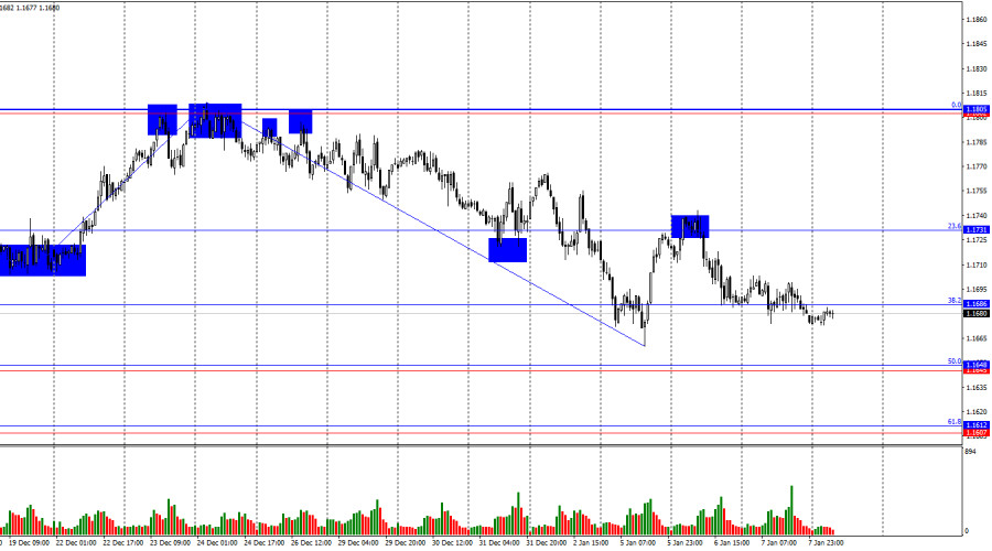 Пара EUR/USD в среду продолжала процесс падения, который длится уже две недели, но при этом активность трейдеров была минимальной. Ниже мы разберемся с этим моментом более подробно. Закрепление котировок под уровнем Фибо 38,2% – 1,1686 позволяет рассчитывать на продолжение падения в направлении зоны поддержки 1,1645–1,1648. Закрытие пары сегодня над уровнем 1,1686 позволит трейдерам ожидать некоторый рост в направлении коррекционного уровня 23,6% – 1,1731.Ситуация с волнами на часовом графике остается простой. Последняя завершенная волна вверх не пробила пик предыдущей волны, а новая волна вниз пробила предыдущий лоу. Таким образом, тренд изменился на «медвежий». На мой взгляд, падение пары не будет долгим, но теперь нужен слом уже «медвежьего» тренда, чтобы ожидать новый рост евро. Слом по текущей графической картине произойдет выше зоны сопротивления 1,1795–1,1802 или после двух «бычьих» волн подряд. В среду у трейдеров было достаточное количество инфоповодов для активных действий на рынке. Но как это ни странно, практически все экономические данные были проигнорированы. Началось все с отчета по инфляции в еврозоне, который вызывал некоторые опасения. Опасения касались будущих действий ЕЦБ по ДКП. Немецкая инфляция показала резкое замедление по итогам декабря, и многие трейдеры ожидали существенного замедления европейской. Если бы это случилось, вероятность ужесточения ДКП ЕЦБ в 2026 году свелась бы практически к нулю. Более того, снижение инфляции ниже целевого уровня центрального банка означало бы, что вероятность нового снижения процентных ставок выше, чем повышения. Несмотря на отсутствие падения индекса потребительских цен ниже 2%, опасность дальнейшего замедления инфляции все равно сохраняется. Темпы роста цен в Европе замедляются третий месяц подряд, но в среднесрочном плане они уже 10 месяцев стабильно находятся около 2%.