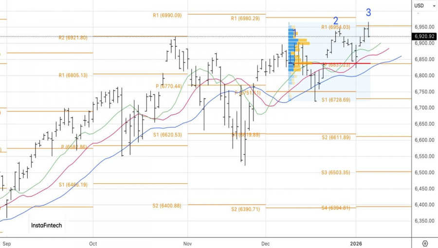 Однако пока рынок приходит в себя на фоне геополитических потрясений и чутко реагирует на макростатистику, чтобы понять, будет ли ФРС снижать ставки весной или нет? В этом отношении взлет деловой активности в сфере услуг до 14-месячного максимума и увеличение занятости в частном секторе от ADP на 41 тыс. в декабре стали поводом для распродаж широкого фондового индекса. Он упал вместе с шансами мартовской монетарной экспансии. Деривативы оценили их в 45%. Еще на старте недели к 9 декабря был 51%. Технически на дневном графике S&P 500 есть предпосылки для активации разворотного паттерна Три индейца. Для этого котировки должны упасть ниже 6920. Пока широкий фондовый индекс торгуется выше, следует сохранять акцент на покупки. В обратном случае имеет смысл вооружится стратегией краткосрочных продаж. Материал предоставлен компанией InstaForex - www.instaforex.com