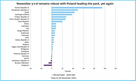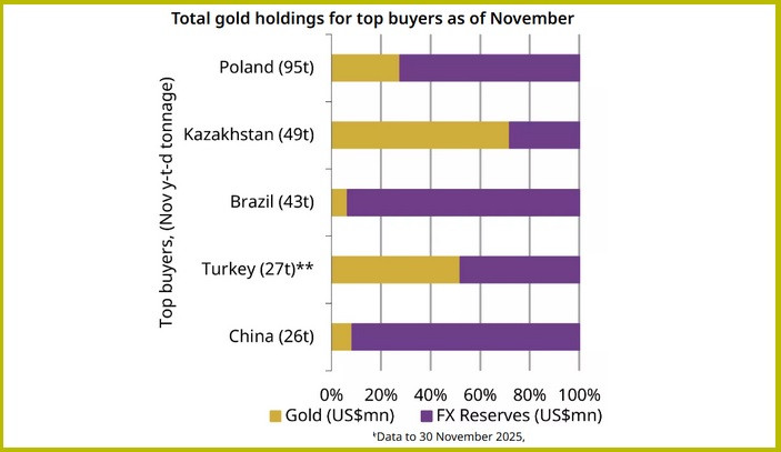Спрос центральных банков на золото в ноябре сохранил стабильность. Чистые покупки достигли 45 тонн, а с начала года — 297 тонн, поскольку банки развивающихся рынков продолжают масштабные приобретения драгметалла. Доля золотых резервов у ведущих центральных банков-покупателей в общем объеме резервов сильно варьируется.Национальный банк Польши добавил 12 тонн, продлив серию закупок с октября. Эти приобретения подняли золотые резервы банка до 543 тонн, или почти 28% от общих резервов по ценам конца ноября.