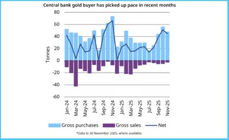 По данным Мариссы Салим, старшего руководителя исследовательского отдела по Азиатско-Тихоокеанскому региону Всемирного совета по золоту, в ноябре 2025 года центральные банки приобрели 45 тонн золота, причем Национальный банк Польши два месяца подряд лидировал по объему чистых закупок.