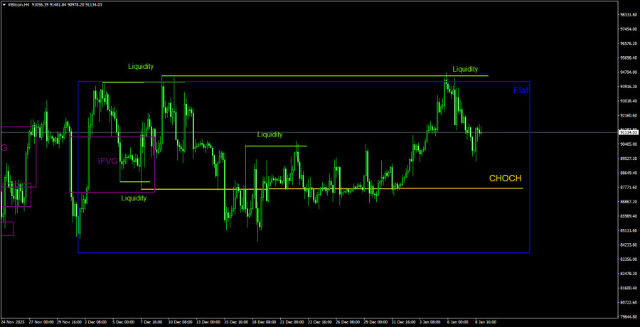 Биткоин продолжает четко следовать технической картине. Мы говорили о том, что ожидать формирования сигналов внутри бокового канала можно только около его границ. Около верхней и нижней линий флэта можно ожидать только девиации и снятия ликвидности. Именно девиацию со снятием ликвидности мы и увидели в 5 января. Таким образом, трейдеры имели отличный сигнал на продажу, который в данное время продолжает отрабатываться. Многие эксперты положительно оценили начало года для криптовалютного рынка, считая, что биткоин демонстрирует намерения расти весь 2026 год. На наш взгляд, это абсолютно не так. На 4-часовом ТФ отлично виден флэт, а флэт – это всегда рэндом. Грубо говоря, нет никакой зависимости между ростом в начале года и возможным ростом в течение года. Биткоин просто торгуется внутри ограниченного ценового диапазона, внутри которого возможен, как рост, так и падение. Также отметим, что действия Трампа в Венесуэле и его последующие угрозы в адрес половины стран Латинской Америки и даже Евросоюза никоим образом не влияют на криптовалютный рынок. Биткоин сначала рос, теперь отлично падает, что полностью соответствует технической картине. И фундамент здесь совершенно не при чем. В целом, биткоин продолжает корректироваться, что хорошо видно на дневном ТФ. Когда завершится коррекция – зависит не от Дональда Трампа или макроэкономических данных в США. Это зависит от самого рынка. Напомним, что флэт – это время накопления или распределения позиций. В данное время маркет-мейкеры активно распределяют или же накапливают новые сделки. Когда этот процесс будет завершен, тогда начнется новое трендовое движение. А мы можем лишь попытаться определить это движение при помощи технического анализа. Что мы и делаем каждый день.