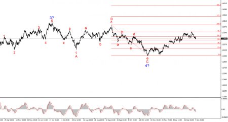 Волновая картина инструмента GBP/USD видоизменилась. Понижательная коррекционная структура a-b-c-d-e в C в 4 носит завершенный вид, как и вся волна 4. Если это действительно так, я ожидаю, что основной участок тренда возобновит свое построение с первоначальными целями около 38 и 40 фигур. В краткосрочном плане я ожидал построение волны 3 или с с целями, расположенными около отметок 1,3280 и 1,3360, что приравнивается к 76,4% и 61,8% по Фибоначчи. Эти цели достигнуты. Волна 3 или с предположительно завершила свое построение, поэтому в ближайшее время может наблюдаться построение понижательной волны или набора волн.Основные принципы моего анализа:
