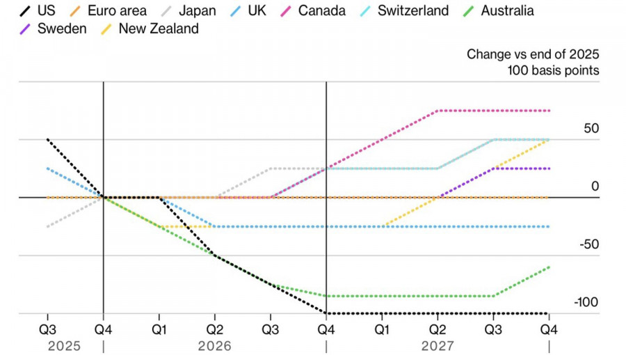 Неожиданное событие перевернуло все с ног на голову на Forex. До этого трейдеры пересматривали свои взгляды на доллар США. Продолжительная пауза в цикле монетарной экспансии ФРС превратила его из гадкого утенка в прекрасного лебедя. Рост занятости на 50 тыс и снижение безработицы до 4,4% в декабре сместили сроки снижения ставки по федеральным фондам с марта-апреля на июнь. Даже если другие центробанки возьмут курс на удержание стоимости заимствований, длительный перерыв в цикле делает из гринбэка фаворита. Нетерпеливость Дональда Трампа все меняет. Президент США хочет как можно быстрее наполнить состав FOMC своими людьми, чтобы снизить ставку по федеральным фондам до 1% и ниже. На первый взгляд, это выглядит нереальным в столь сильной экономике, как американская. Однако давайте вспомним, как агрессивно намеревается срезать стоимость заимствований человек Белого дома в составе Комитета Стиве Миран. По его мнению, ставки уже в 2026 должны упасть на 150 б.п до 2,25%. Динамика и прогнозы по ставкам центральных банков