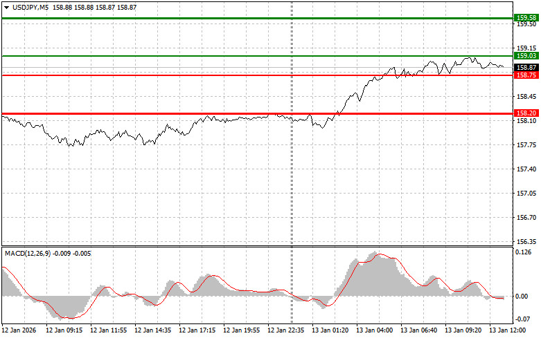 Разбор сделок и советы по торговле японской иенойТестов обозначенных уровней в первой половине дня так и не произошло. Кажется, рынок переварил возможный роспуск правительства Японии, а заявления представителей Центрального банка ограничили дальнейшее падение японской иены в первой половине дня. Теперь участники рынка будут пристально следить за публикацией статистики по инфляции. Превышение фактического уровня инфляции ожидаемого может стать аргументом в пользу более ограничительной политики процентных ставок в США. С другой стороны, более скромные темпы роста цен дадут ФРС больше гибкости в плане смягчения текущей политики, что потенциально может оказать давление на доллар в паре с иеной.Объем продаж нового жилья также находится под пристальным вниманием, поскольку этот показатель является ключевым индикатором состояния рынка недвижимости и общеэкономической активности. Устойчивые показатели продаж могут свидетельствовать о стабильности жилищного сектора. Выступление члена Комитета по операциям на открытом рынке Альберто Мусалема вряд ли сильно повлияет на расстановку сил участников рынка в паре USD/JPY, но все же оно будет изучено на предмет намеков относительно видения текущего состояния экономики и прогнозов относительно процентных ставок. Что касается внутридневной стратегии, то больше буду опираться на реализацию сценариев №1 и №2.Сигнал на покупкуСценарий №1: покупать USD/JPY сегодня планирую при достижении точки входа в районе 159.03 (зеленая линия на графике) с целью роста к уровню 159.58 (более толстая зеленая линия на графике). В районе 159.58 буду выходить из покупок и открывать продажи в обратную сторону (расчет на движение в 30-35 пунктов в обратную сторону от уровня). Рассчитывать на рост пары можно в продолжение тренда. Важно! Перед покупкой, убедитесь в том, что индикатор MACD находится выше нулевой отметки и только начинает свой рост от нее.Сценарий №2: покупать USD/JPY сегодня также планирую в случае двух подряд тестов цены 158.75 в момент, когда индикатор MACD будет находиться в области перепроданности. Это ограничит нисходящий потенциал пары и приведет к обратному развороту рынка вверх. Можно ожидать рост к противоположным уровням 159.03 и 159.58.Сигнал на продажу Сценарий №1: продавать USD/JPY сегодня планирую после обновления уровня 158.75 (красная линия на графике), что приведет к быстрому снижению пары. Ключевой целью продавцов будет уровень 158.20, где буду выходить из продаж, а также открывать сразу покупки в обратную сторону (расчет на движение в 20-25 пунктов в обратную сторону от уровня). Давление на пару сегодня вернется в случае мягкой позиции ФРС. Важно! Перед продажей, убедитесь в том, что индикатор MACD находится ниже нулевой отметки и только начинает свое снижение от нее. Сценарий №2: продавать USD/JPY сегодня также планирую в случае двух подряд тестов цены 159.03 в момент, когда индикатор MACD будет находиться в области перекупленности. Это ограничит восходящий потенциал пары и приведет к обратному развороту рынка вниз. Можно ожидать снижения к противоположному уровню 158.75 и 158.20.Что на графике:Тонкая зеленая линия – цена входа, по которой можно покупать торговый инструмент;Толстая зеленая линия – предположительная цена, где можно расставлять Take Profit или самостоятельно фиксировать прибыль, так как выше этого уровня дальнейш