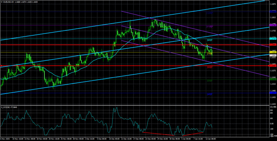 Валютная пара EUR/USD в течение вторника торговалась достаточно спокойно, несмотря на отчет по инфляции в США. За всего две первые недели нового года в Штатах произошло столько событий, что мы бы не удивились, если бы сейчас пара находилась пунктов на 300 выше или ниже текущей цены. Однако, по сути, мы увидели всего лишь два дня девяти, когда движения имели хоть какую-то силу. В целом, рынок продолжает показывать, что в активной торговле он не заинтересован, а флэт на дневном ТФ между уровнями 1,1400 и 1,1830 длится уже шесть месяцев. Таким образом, каждый новый день не приносит ничего нового. В начале года Трамп провел военную операцию в Венесуэле, а уже в ближайшее время может ударить по Ирану и аннексировать Гренландию. Посмотрите на графики – есть ли ощущение, что в мире происходят глобальные события? Хорошо, доллар и рынок не любят геополитику. В начале года в Америке уже были опубликованы важные индексы деловой активности ISM, NonFarm Payrolls и уровень безработицы. А вчера еще и инфляция подоспела. И что? Рынок все также стоит на месте, демонстрируя движения в среднем на 50 пунктов в день и преимущественно вбок. Таким образом, в данное время вообще нецелесообразно говорить о рыночных предпочтениях. Какие могут быть предпочтения, если пара стоит на месте полгода? Дональд Трамп собирается «дожать» Джерома Пауэлла и отправить его в отставку с позором. И это еще одно событие, которое вполне заслуживает шторма на валютном рынке. Очевидно, что президент США не отстанет от ФРС и будет делать все, чтобы «перекроить» состав комитета FOMC. О прямом вмешательстве в работу ФРС знает уже каждый начинающий трейдер. Абсолютно каждый понимает, что единственная цель уголовного расследования против Джерома Пауэлла – показательное смещение его с должности и демонстрация другим чиновникам ФРС, что с Трампом шутки плохи. Однако, по иронии судьбы, Трампу будет гораздо легче забрать себе Гренландию, чем заставить ФРС голосовать по ставке так, как ему хочется. Предположим, уже завтра Пауэлл сам уйдет в отставку, что это изменит? Придет новый председатель, и тогда в распоряжении Трампа будет четыре «голубя» в комитете FOMC. Все равно недостаточно для того, чтобы понизить ключевую ставку до 1% или 2%. Внутри комитета FOMC 12 голосующих членов, поэтому минимум шестеро должны быть всецело на стороне мнения Трампа. Таким образом, воевать с ФРС Трамп будет еще очень долго. Может быть, в конечном итоге, он одержит победу. Мы же даже без этого события считаем, что доллар будет только падать в среднесрочной перспективе. Если Трамп начнет руководить еще и ФРС, то тогда уже проще будет самому республиканцу устанавливать курс доллара против евро, фунта или йены. А в чем проблема? Почему президент США не может решать, какой курс будет у его национальной валюты? Средняя волатильность валютной пары EUR/USD за последние 5 торговых дней по состоянию на 14 января составляет 47 пунктов и характеризуется, как «низкая». Мы ожидаем движение пары между уровнями 1,1597 и 1,1691 в среду. Старший канал линейной регрессии направлен вверх, но по факту все еще продолжается флэт на дневном ТФ. Индикатор CCI последней сформировал еще одну «бычью» дивергенцию, которая вновь указывает на возобновление восходящего тренда. Однако ключевым моментом остается флэт на дневном ТФ. Ближайшие уровни поддержки: S1 – 1,1597 S2 – 1,1536 S3 – 1,1475 