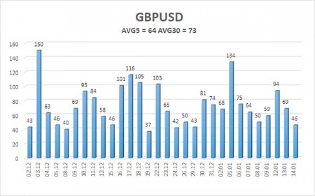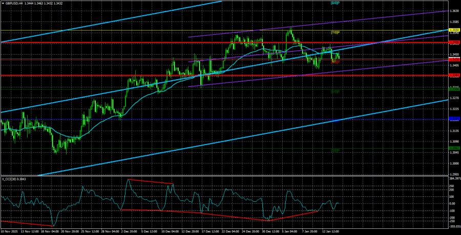 Валютная пара GBP/USD в среду продолжала торговаться больше вбок, чем вверх или вниз. Хоть, в отличие от евровалюты, фунт стерлингов не находится семь месяцев во флэте, в последние недели именно флэт мы и наблюдаем. Британский фунт не хочет полностью уподобляться европейской валюте, поэтому время от времени для проформы демонстрирует более или менее ощутимые движения. Но вряд ли кто-либо будет отрицать тот факт, что волатильность в последние месяцы сильно понизилась и по паре GBP/USD. Мы продолжаем придерживаться той же точки зрения, что и раньше. Прежде всего, хотим заметить, что не стоит искать объяснений там, где их нет. Сейчас многие эксперты постоянно сообщают о новых планах Трампа по захвату Гренландии или перевороту в Мексике, или же по атаке на Иран. СМИ трубят о уголовном расследовании против Джерома Пауэлла. Макроэкономическая статистика по рынку труда, безработице и инфляции в США давала достаточно причин не стоять рынку на одном месте. И нет, все эти события – не «пустые» и не второстепенные. Но проблема не в том, что они не имеют значения, а в том, что рынок не хочет их отрабатывать. Напомним, что рынок – это люди. Если выходит отчет NonFarm Payrolls, и вы видите провальное значение, обязаны ли вы открывать сделку на продажу доллара? Нет. Вы лишь можете это сделать, если хотите. Тоже самое и в торгах на межбанковском уровне. Какие бы новости не поступали из США, никто не обязан в прямом смысле этого слова отрабатывать их немедленно. Напомним, что многие события рынок любит учитывать заранее, авансом. А в некоторых случаях наоборот копит факторы для будущего тренда. Если бы каждый раз пара показывала полностью логичное и закономерное движение, зарабатывал бы на рынке каждый первый. В том-то и дело, что рынок работает гораздо сложнее, а управляют им люди, цель которых получить прибыль за счет других людей. Вернемся к противостоянию Трампа и Пауэлла. Ни для кого уже не секрет, что суд над Пауэллом не имеет никакого смысла в разрезе влияния Трампа на монетарную политику ФРС. Зачем тогда он нужен? Во-первых, месть. Пауэлл 8 лет игнорировал запросы Трампа, а президент США не из тех людей, которые забывают обиды. Во-вторых, в назидание другим членам FOMC. Если каждый из действующих чиновников ФРС будет осознавать, что сегодня он не проголосует за снижение ключевой ставки, а завтра ему придет повестка в суд за то, что он перешел дорогу в неположенном месте 8 лет назад, то вероятность принятия «голубиных» решений будет гораздо выше. Напомним, что Трамп уже «убрал» Адриану Куглер, попытался уволить Лизу Кук, сейчас на очереди Джером Пауэлл. А в будущем подобная судьба может коснуться любого другого представителя Комитета FOMC. Как итог, Трамп продолжает войну с ФРС до полной победы или полного поражения. Иного результата в этом противостоянии быть не может. Средняя волатильность пары GBP/USD за последние 5 торговых дней составляет 64 пунктов. Для пары фунт/доллар это значение является «средним». В четверг, 15 января, таким образом, мы ожидаем движения внутри диапазона, ограниченного уровнями 1,3364 и 1,3500. Старший канал линейной регрессии развернулся вверх, что указывает на восстановление тренда. Индикатор CCI шесть раз заходил в область перепроданности за последние месяцы и сформировал множество «бычьих» дивергенций, что постоянно предупреждает трейдеров о продо