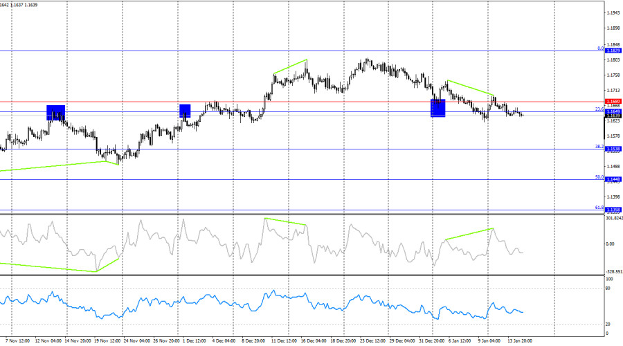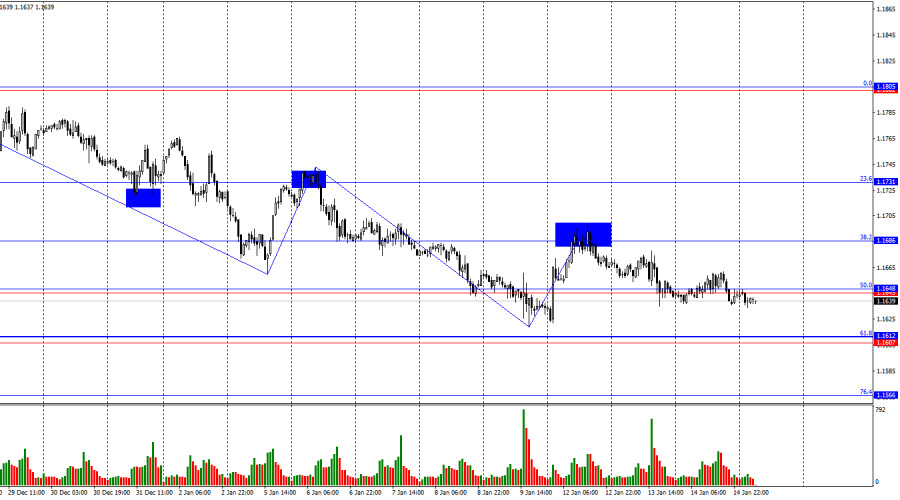 Ситуация с волнами на часовом графике остается простой. Последняя завершенная волна вверх не пробила пик предыдущей волны, а последняя волна вниз пробила предыдущий лоу. Таким образом, тренд остается «медвежьим». На мой взгляд, падение пары не будет длительным и сильным, но теперь нужен слом уже «медвежьего» тренда, чтобы ожидать «бычьего» наступления. Слом по текущей графической картине произойдет выше уровня 1,1700. В среду преимуществом на рынке не обладали ни быки, ни медведи, а сила движений не позволяет употреблять слово «атаковали» в любом контексте. Рынок практически полностью обездвижен, и сдвинуть его с места не получается у новостей абсолютно любого характера. Вчера в Америке вышли индекс цен производителей и изменение объемов розничной торговли. Ни первый отчет, ни второй не смогли заинтересовать трейдеров. Сегодня ночью стало известно об отмене военной операции в Иране в ближайшее время. Дональд Трамп на брифинге Белого дома сообщил, что к нему поступила информация из проверенных источников о прекращении казней среди протестующего населения со стороны властей Ирана. «Мы будем внимательно следить за ситуацией и проверим полученную информацию. Если она окажется ложной, военная операция будет проведена. Цели для атаки установлены», – сообщил президент США. На текущую минуту рынок никак не отреагировал и на эту новость. Пружина на рынке сжалась до невообразимых значений. Рано или поздно она «выстрелит».
