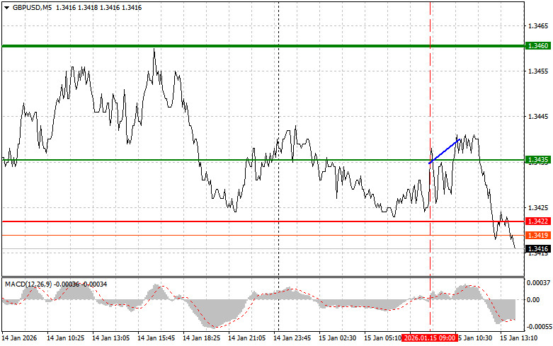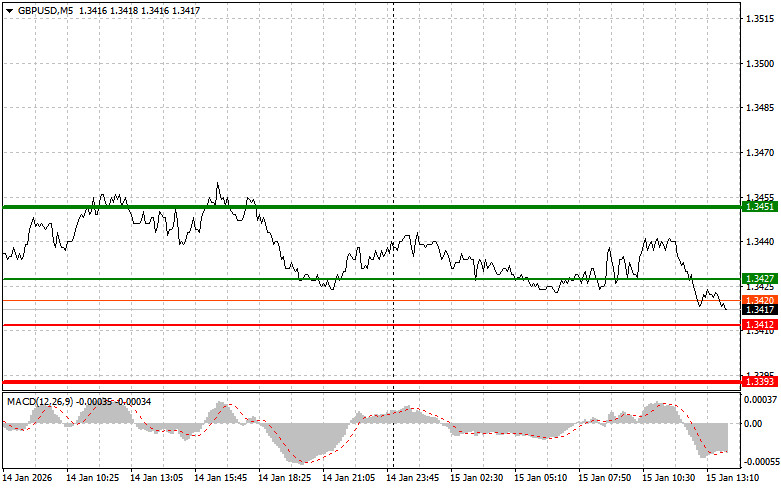 Разбор сделок и советы по торговле британским фунтомТест цены 1.3435 пришелся на момент, когда индикатор MACD только начинал движение вверх от нулевой отметки, что стало подтверждением правильной точки входа на покупку фунта. В результате пара выросла лишь на 9 пунктов, и на этом бычий потенциал иссяк. Данные по росту ВВП Великобритании на 0,3% в ноябре прошлого года не оказали существенной поддержки фунту. По всей видимости трейдеры сохраняли осторожный подход, ожидая более четких сигналов от Банка Англии относительно будущей денежно-кредитной политики. Несмотря на умеренное улучшение экономических показателей, опасения относительно устойчивой инфляции и потенциальной рецессии продолжали довлеть над рынком.Сегодняшние данные по числу первичных обращений за пособием по безработице станут важным индикатором состояния рынка труда. Устойчивое снижение числа обращений может свидетельствовать о силе экономики и потенциальном инфляционном давлении. В то же время неожиданный рост может указать на замедление экономического роста и потенциальную необходимость дальнейшего смягчения денежно-кредитной политики со стороны ФРС. Производственный индекс ФРС-Филадельфии является опережающим индикатором экономической активности в производственном секторе. Инвесторы будут внимательно следить за этим показателем, чтобы оценить перспективы экономического роста в стране.Финалом станут выступления членов FOMC Бостика и Баркина, которые могут предоставить ценную информацию о текущем состоянии экономики и перспективах денежно-кредитной политики Федеральной резервной системы. Что касается внутридневной стратегии, то больше буду опираться на реализацию сценариев №1 и №2.Сигнал на покупкуСценарий №1: покупать фунт сегодня планирую при достижении точки входа в районе 1.3427 (зеленая линия на графике) с целью роста к уровню 1.3451 (более толстая зеленая линия на графике). В районе 1.3451 буду выходить из покупок и открывать продажи в обратную сторону (расчет на движение в 30-35 пунктов в обратную сторону от уровня). На рост фунта сегодня можно рассчитывать только после голубиных комментариев представителей ФРС. Важно! Перед покупкой, убедитесь в том, что индикатор MACD находится выше нулевой отметки и только начинает свой рост от нее.Сценарий №2: покупать фунт сегодня также планирую в случае двух подряд тестов цены 1.3412 в момент, когда индикатор MACD будет находиться в области перепроданности. Это ограничит нисходящий потенциал пары и приведет к обратному развороту рынка вверх. Можно ожидать рост к противоположным уровням 1.3427 и 1.3451.Сигнал на продажу Сценарий №1: продавать фунт сегодня планирую после обновления уровня 1.3412 (красная линия на графике), что приведет к быстрому снижению пары. Ключевой целью продавцов выступит уровень 1.3393 где буду выходить из продаж, а также открывать сразу покупки в обратную сторону (расчет на движение в 20-25 пунктов в обратную сторону от уровня). Давление на фунт сегодня может вернуться в случае сильных данных по США. Важно! Перед продажей, убедитесь в том, что индикатор MACD находится ниже нулевой отметки и только начинает свое падение от нее.Сценарий №2: продавать фунт сегодня также планирую в случае двух подряд тестов цены 1.3427 в момент, когда индикатор MACD будет находиться в области перекупленности. Это ограничит восходящи