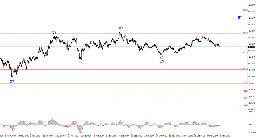 Курс инструмента EUR/USD в течение четверга снизился примерно на 20 базовых пунктов в началу американской сессии, а амплитуда движений опять была минимальной. Новостной фон сегодня мог оказать поддержку как покупателям, так и продавцам, но продолжаем мы наблюдать инертное и инерционное движение вниз. Мне крайне сложно сказать, с чем именно связано ежедневное снижение европейской валюты, если, например, сегодня экономический фон в Евросоюзе был достаточно силен. Если ВВП в Германии за 2025 год не впечатлил, но и не разочаровал, то промышленное производство в Евросоюзе возросло в объемах на 2,5% в годовом исчислении, что выше ожиданий рынка. Однако отчет по промпроизводству не спас евро от потери очередных 20-30 пунктов. Что касается американской статистики, то к моменту падения инструмента на очередные, пресловутые 20 пунктов в Америке еще не вышло ни одного отчета. Дональд Трамп сегодня ночью заявил, что в ближайшее время американские военные силы не будут атаковать правительственные и военные объекты Ирана, так как «была получена информация об отказе иранских властей от расстрелов митингующих и протестующих». Но президент США пообещал держать руку на пульсе иранского госпереворота. Если геополитическая обстановка на Ближнем Востоке смягчилась, рынок должен был ответить снижением спроса на американскую валюту. Но видим мы противоположное движение. Примерно каждый день. Исходя из всего вышесказанного, я делаю вывод, что в данное время с высокой долей вероятности начал построение очередной коррекционный набор волн внутри предполагаемой глобальной волны 4. И отталкиваться в ближайшее время можно только от волновой разметки, хоть она и достаточно сложна и неоднородна.Общие выводы