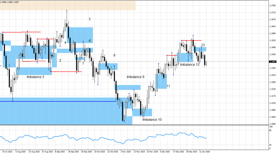 Пара GBP/USD также продолжает процесс падения и выполнила разворот в пользу американского доллара. Следует признать, что падение британца по сравнению с падением европейца не выглядит устрашающе. Однако последние «бычьи» паттерны были проигнорированы, 6 января был произведен съем ликвидности с последнего «бычьего» свинга, а затем – был сформирован «медвежий» имбаланс 13 и практически сразу же получена на него реакция. Таким образом, если падение евровалюты можно было спрогнозировать только по съему ликвидности, топ падение британца – по съему ликвидности и «медвежьему» паттерну.