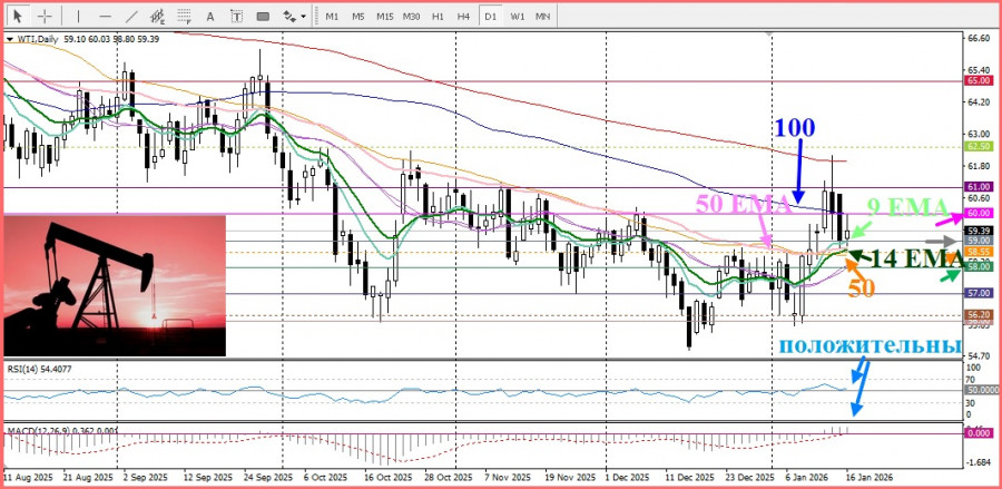 Несмотря на эту геополитическую поддержку, геополитическая напряженность никуда не делась, фундаментальные факторы рынка продолжают оказывать давление на среднесрочные перспективы американской нефти марки WTI. Так же, стоит не забывать, что нефть находится под давлением из-за ожиданий обильного предложения в 2026 году, несмотря на ранние оценки ОПЕК о балансе рынка. Свежие данные по запасам нефти в США вновь обострили опасения перепроизводства при шатком спросе.