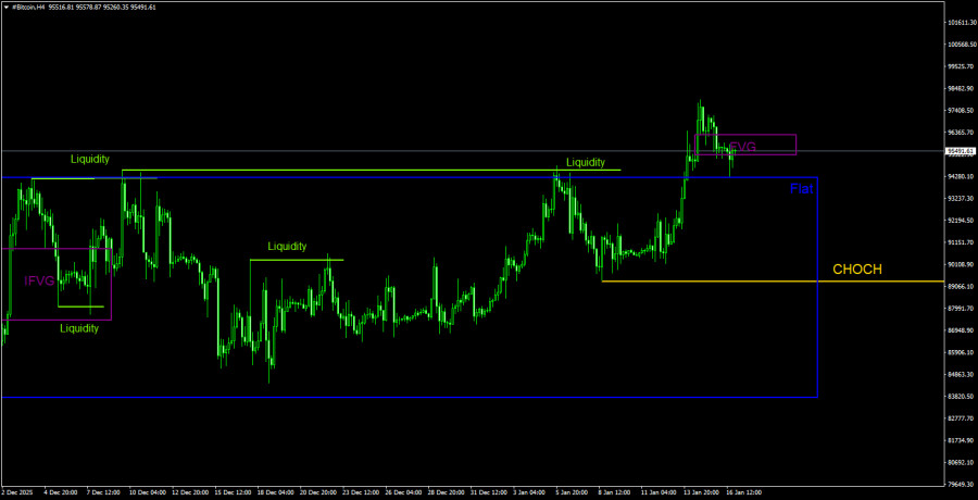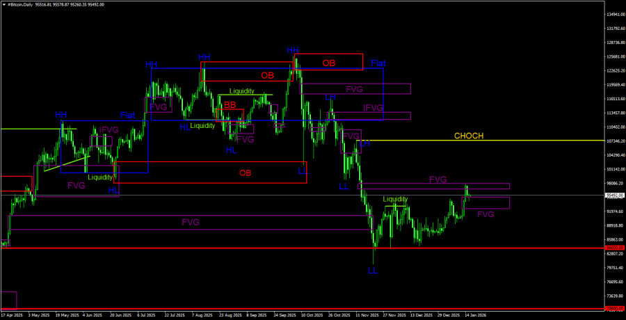 Биткоин продолжает умеренный рост, который обладает всеми признаками коррекции. Посмотрите на прошлый восходящий тренд, на последние нисходящий: во всех случаях трендовое движение было гораздо более сильным и резким, чем коррекции. Таким образом, только по этому признаку мы считаем, что в данное время мы наблюдаем именно коррекцию. Биткоин больше ползет вверх, чем растет. Однако это не означает, что коррекция завершена. Цена получила реакцию на трендовый «медвежий» FVG на дневном ТФ, но снизу ее теперь подпирает новый «бычий» FVG. Таким образом, и на этот паттерн может последовать реакция. Тогда движение на Север продолжится. В текущей ситуации нужна отмена двух последних «бычьих» FVG на обоих ТФ, чтобы ожидать возобновления нисходящего тренда. Фактически торговый сигнал на продажу уже сформирован. Трейдеры имели возможность на этой неделе открывать короткие позиции. В качестве подтверждения сигналу можно дождаться слома структуры на часовом ТФ. На этом графике линия CHOCH пролегает на уровне 94 550$. Если этот уровень будет уверенно преодолен, трейдеры смогут наращивать короткие позиции от ближайших «медвежьих» паттернов. Но слома пока не случилось... Какие цели падения у биткоина? Если коррекция завершена, то минимальной целью падения в среднесрочной перспективе выступает уровень 70 800$. В течение 2026 года мы допускаем и гораздо более сильное падение первой криптовалюты в мире. Что касается влияния макроэкономического и фундаментального фона, то все рынки сейчас находятся в прострации. События в новом году развиваются стремительно и многие из них носят настолько противоречивый характер, что просто игнорируются трейдерами. Мы не можем сделать вывод о том, что биткоин растет из-за событий, связанных с Пауэллом или военной агрессией Трампа по отношению к странам Латинской Америки, Ирана и даже Европы.