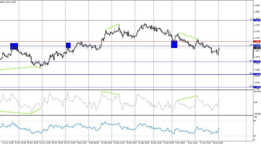 Ситуация с волнами на часовом графике остается простой. Последняя завершенная волна вверх не пробила пик предыдущей волны, а последняя волна вниз пробила предыдущий лоу. Таким образом, тренд остается «медвежьим». На мой взгляд, падение пары не будет длительным и сильным, но теперь нужен слом уже «медвежьего» тренда, чтобы ожидать «бычьего» наступления. Слом по текущей графической картине произойдет выше уровня 1,1700. В пятницу пара EUR/USD торговалась достаточно спокойно, а информационный фон был слаб. Отчет по промышленному производству в США оказал дополнительную поддержку американской валюте, но в целом рынок сейчас сосредоточен на совершенно других, более глобальных, геополитических темах, а не на рядовых экономических отчетах. Сегодня ночью стало известно, что Дональд Трамп вводит новые торговые тарифы. На этот раз пострадали Германия, Дания, Норвегия, Швеция, Великобритания, Франция, Голландия и Финляндия. Какой на этот раз придумал повод президент США? Гренландия. По мнению Трампа, страны Евросоюза, которым косвенно и принадлежит Гренландия, должны были оказаться в восторге от предложения Вашингтона аннексировать самый большой остров на Земле. И фактически позволить Америке контролировать его, размещать на нем свои военные базы, использовать в своих целях, которые при Трампе спрогнозировать невозможно. Безусловно, в Европе не испытали эйфории по этому поводу, а Трамп перешел к своей излюбленной стратегии под названием «вводи тарифы, если кто-то с тобой не согласен». Таким образом, 2026 год начинается с новой торговой войны, глобального экономического и геополитического противостояния.