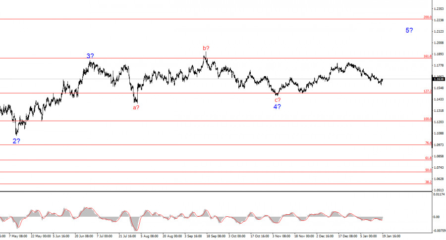 Курс инструмента EUR/USD в течение понедельника прибавил около 50 базовых пунктов, что по-прежнему очень мало, чтобы делать какие-либо громкие выводы. Амплитуда движений остается низкой уже несколько месяцев подряд, рынок находится в спячке и практически не реагирует на происходящее в мире. Честно говоря, в обычное время новости о возбуждении уголовного дела против президента ФРС, попытка Трампа аннексировать Гренландию, новая эскалация Глобальной торговой войны, новый конфликт Трампа и ЕС, события в Иране и так далее вызвали бы серьезные волнения на валютном рынке. Но рынок в начале нового года продолжает безмолвствовать и бездействовать. Большая часть роста европейской валюты в понедельник пришлась на 1 час на открытии рынка. Трейдеры очень быстро отыграли новые пошлины Трампа и возможные ответные санкции Евросоюза. Но и экономические события в понедельник имели место. Так мы узнали, что индекс потребительских цен в Еврозоне по итогам декабря замедлился до 1,9% в годовом исчислении. И надо сказать, это достаточно опасное значение для европейской валюты. Инфляция опустилась ниже целевой отметки ЕЦБ. Если эта тенденция сохранится, регулятору в определенный момент времени придется вмешаться, чтобы не допустить еще большего замедления. А вмешаться ЕЦБ может только одним способом – провести еще один раунд смягчения денежно-кредитной политики. Хоть участники рынка весь 2025 год не обращали никакого внимания на снижение ставок ЕЦБ, в 2026 году ситуация может быть иной. В 2025 году рынок был полностью сосредоточен на торговой войне, давлении Трампа на ФРС, противостоянии с Китаем и внутренними инициативами новой администрации Белого дома. В 2026 году мы пока не знаем, что будет находиться в приоритете у трейдеров. Но первые события текущего года позволяют допустить, что в фокусе рынка будут находиться те же самые факторы, что и раньше.Общие выводы