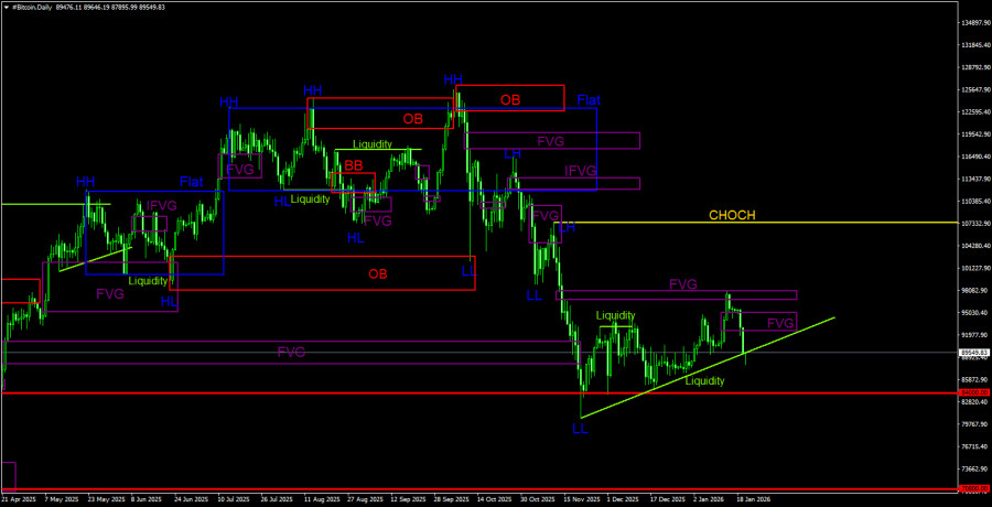 Биткоин продолжает падение после того, как был сформирован сигнал на продажу на дневном ТФ, которого мы ждали примерно месяц. Всего за два дня «цифровое золото» подешевело на 6 000$. Напомним, что в ходе последнего витка нисходящего тренда был сформирован только один «медвежий» FVG, от которого в итоге и была получена реакция цены. «Бычий» FVG был отменен, что совершенно не удивительно. Реакции цены на него в любом случае не последовало. На этой неделе может быть сформировано несколько новых «медвежьих» FVG, так как цена движется вниз очень быстро. Также отметим, что у биткоина имеется свой пул ликвидности, аналогичный пулу по эфиру. На нисходящем тренде мы практически уверены, что биткоин опустится глубоко ниже восходящей линии тренда. На 4-часовом ТФ цена вчера получила реакцию от ближайшего «медвежьего» FVG, а затем сформировала еще несколько аналогичных паттернов. Мы выделили один – самый последний. Именно от него сегодня может быть получена реакция. Локальная восходящая структура сломлена. Минимальной целью падения биткоина в среднесрочной перспективе выступает уровень 70 800$. В течение 2026 года мы допускаем и гораздо более сильное падение первой криптовалюты в мире. Что касается влияния макроэкономического и фундаментального фона, то все рынки сейчас находятся в прострации. События в новом году развиваются стремительно и многие из них носят настолько противоречивый характер, что просто игнорируются трейдерами. Мы не можем сделать вывод о том, что биткоин растет или падает из-за событий, связанных с Джеромом Пауэллом или военной агрессией Трампа по отношению к странам Латинской Америки, Ирана или Гренландии.