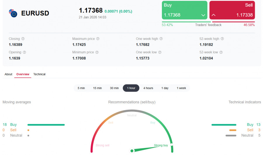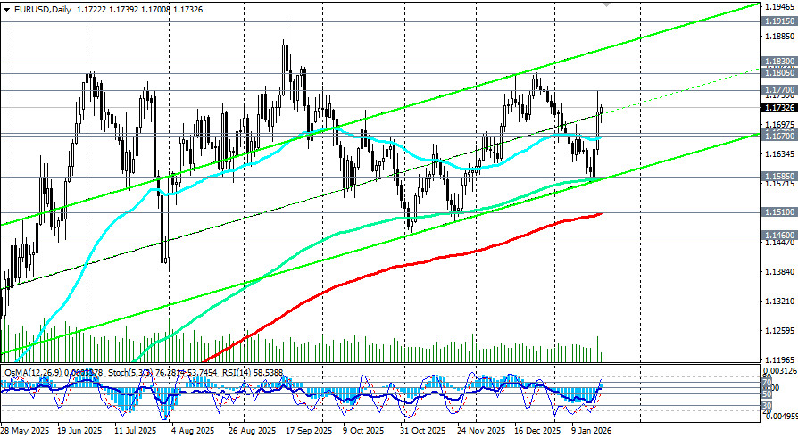 *) см. также: Торговые индикаторы InstaForex по EUR/USD[/i] Во второй половине января 2026 года EUR/USD торгуется в рамках коррекционного восходящего движения в районе 1.1700 – 1.1740. Пара получает поддержку за счёт ослабления доллара США и улучшения макроэкономических настроений в Еврозоне, тогда как американская валюта остаётся под давлением геополитических и торговых факторов. Текущая динамика пары отражает не столько усиление евро, сколько снижение доверия к доллару США на фоне роста политической неопределённости и рисков новой торговой войны. Американская валюта ослабла после заявлений президента США Дональда Трампа о введении 10% импортных тарифов против ряда стран ЕС с 1 февраля и о возможном повышении пошлин до 20–25% с июня. Рынки расценили риторику Белого дома как возвращение к агрессивной торговой политике, что уже приводило к росту волатильности и оттоку капитала из американских активов в прошлом. На этом фоне фондовые индексы США демонстрируют снижение, усиливается спрос на защитные активы — золото и гособлигации, а доллар теряет позиции против основных валют, включая евро. Геополитика против макроэкономики