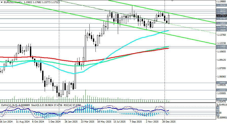 Основной сценарий При сохранении торговой напряжённости между США и ЕС и нейтральной позиции ФРС EUR/USD будет торговаться в диапазоне 1.1510 (ЕМА200 на дневном графике цены) –1.1800 (локальные максимумы). Рост евро останется ограниченным и носить коррекционный характер. Альтернативный сценарий В случае деэскалации торговых конфликтов, усиления экономики США, более жёсткой риторики ФРС доллар может восстановить позиции, а пара вернётся в область 1.1510 – 1.1460 (ЕМА50 на недельном графике). *) подробнее см. в EUR/USD: сценарии динамики на 21.01.2026[i]