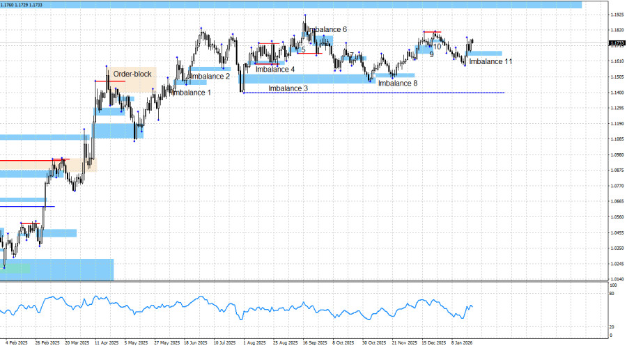 Безусловно, благодарить за падение доллара на этой неделе следует только Дональда Трампа. На экономические отчеты в течение недели трейдеры не обращали никакого внимания. Апофеозом игнора стала публикация сильного ВВП за третий квартал, который вчера ничем не помог доллару США. Дональд Трамп сначала ввел торговые тарифы для стран ЕС, потом отменил их, но трейдеры в обоих этих событиях увидели только негатив. И, на мой взгляд, они верно разобрались в ситуации, так как подобная чехарда обозначает только одно – решения президента США (на секундочку страны с крупнейшей экономикой в мире) не стоят ничего. Сегодня Трамп может ввести пошлины, завтра отменить их. Сегодня Трамп может заявить о готовности захватить Гренландию силовым методом, а на завтра – передумать. Рынки не могут понять, чего ожидать от Трампа и какие последствия его действий будут для экономики. Поэтому предпочитают при удобной возможности избавляться от американской валюты. На текущий момент продажи доллара не носят массовый характер, но у нас есть новый сигнал, и я ожидаю нового роста пары. Графическая картина продолжает сигнализировать о «бычьей» доминации, но в долгосрочном плане. «Бычий» тренд сохраняется, несмотря на горизонтальное движение в последние месяцы. Вчера был образован новый «бычий» сигнал в имбалансе 11. Таким образом, я вновь ожидаю роста минимум к 1,1976 (нижняя граница недельного имбаланса). Информационный фон в пятницу вновь можно разделить на две части: экономический и политический. Экономический вновь не вызвал особого интереса у трейдеров. Индексы деловой активности в Германии и Евросоюзе были попросту проигнорированы. Политический – отмена пошлин Дональда Трампа и снижение напряжения вокруг Гренландии – мог помочь трейдерам-медведям, но его трейдеры расценили, как негативное событие. Таким образом, на этой неделе на настроение трейдеров влиял только Дональд Трамп. Причин у быков для нового наступления имеется в достатке уже месяцев 4-5, и с каждым новым днем их становится только больше. Это и «голубиные» (в любом случае) перспективы ДКП FOMC, это и общая политика Дональда Трампа (которая не поменялась за последнее время), это и противостояние США с Китаем (где наступило лишь временное перемирие), это и акции протеста американского народа против Трампа под эгидой «No kings», это и слабость рынка труда, это и не радужные перспективы американской экономики (рецессия), это и «шатдаун» (который длился полтора месяца, но явно не был учтен трейдерами). А теперь это еще и военная агрессия США по отношению к некоторым государствам, уголовное преследование Пауэлла и «гренландская неразбериха». Таким образом, дальнейший рост пары, на мой взгляд, будет полностью закономерным. В «медвежий» тренд я по-прежнему не верю. Информационный фон по-прежнему крайне сложно интерпретировать в пользу доллара, поэтому я и не пытаюсь это делать. Синяя линия показывает ценовой уровень, ниже которого можно будет считать «бычий» тренд завершенным. До него медведям нужно пройти вниз около 320 пипсов, и я считаю эту задачу невыполнимой при текущем информационном фоне и в текущих обстоятельствах. Ближайшей целью для роста европейской валюты остается «медвежий» имбаланс 1,1976 – 1,2092 на недельном графике, который был образован еще в июне 2021 года. Календарь новостей для США и Еврос