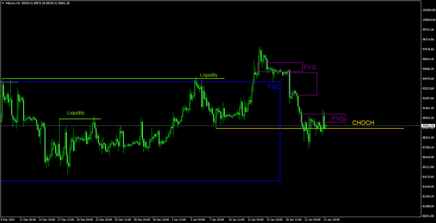 На дневном ТФ биткоин продолжает формирование нисходящей тенденции, а коррекция уже может быть завершена. Структура тренда идентифицируется, как нисходящая, а линия CHOCH в данное время проходит на уровне 107 300$. Только выше этого уровня можно будет считать, что нисходящий тренд завершен. В 2026 году биткоин может падать хоть до 60 000$, откуда начинал свое последнее восхождение. Единственной областью POI для продаж выступал «медвежий» FVG, реакция на который уже была получена. Торговый сигнал сформирован, подтверждение получено. Целью нового витка нисходящего движения может выступать уровень 70 800$ – 50,0% по Фибоначчи. «Бычий» FVG трансформирован в «медвежий» IFVG, который теперь выступает новой областью POI для продаж.Общая картина BTC/USD на 4Н.