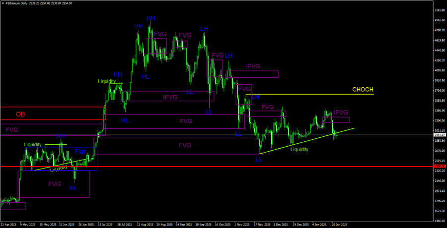 Биткоин продолжает формирование полноценного нисходящего тренда. В ближайшее время стоит ожидать падения к уровню 70 800$(уровень 50,0% по Фибоначчи от трехлетнего восходящего тренда). Из областей POI на продажу на дневном ТФ можно выделить «медвежий» IFVG, расположенный в области 92 500$ – 95 000$. К этому паттерну цена может скорректироваться и от него возобновить падение. На 4-часовом ТФ формируются «медвежьи» FVG, от которых также можно открывать дополнительные короткие позиции или же использовать в качестве подтверждения дальнейшему падению.Рекомендации по торговле ETH/USD:
