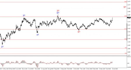 Волновая разметка 4-часового графика для инструмента EUR/USD понесла небольшие изменения, но кардинально ничего не изменилось. Об отмене повышательного участка тренда, который берет свое начало в январе прошлого года, речи по-прежнему не идет, лишь внутренняя волновая структура время от времени корректируется. На мой взгляд, инструмент завершил построение глобальной коррекционной волны 4. Если это предположение верно, то в данное время началось и продолжается построение волны 5, цели которой разбросаны вплоть до 25-й фигуры. Внутренняя волновая структура предполагаемой волны 5 не совсем однозначная. Повышательный набор волн не может считаться импульсным из-за довольно сильных коррекционных волн. Поэтому на текущий момент он трактуется, как a-b-c-d-e. Однако, если волна 5 примет протяженный вид, то ее внутренняя структуры тоже получится достаточно сложной. Как следствие, мы можем наблюдать сейчас построение волны 3 в 3 в 5. Так или иначе, я жду дальнейшего повышения инструмента EUR/USD с целями, расположенными около отметки 1,1918, что соответствует 100,0% по Фибоначчи.
