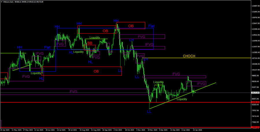 Биткоин продолжает тянуть за собой весь криптовалютный рынок вниз. Мы продолжаем ожидать падения и в краткосрочной перспективе, и в долгосрочной, в отличие от многих экспертов, которые постоянно прогнозируют одно и тоже – рост. Однако для роста мы не видим сейчас ни фундаментальных оснований, ни технических. Конечно, если крупные игроки, маркет-мейкеры, институционалы вновь начнут скупать биткоин, он будет расти в цене. Но в этом случае на графиках начнут появляться технические признаки нового «бычьего» тренда. В данное время таковых нет. Тем временем, основатель криптовалютной биржи Binance Чанпэн Чжао сообщил в интервью, что в текущем году классический четырехлетний цикл по биткоину будет прерван. Напомним, что четырехлетний цикл – это восходящий тренд и затем сильная коррекция, на формирование которых уходит 4 года. Так как биткоин находился в восходящем движении 3 года(в течение которых подорожал с 15 000$ до 126 000$), четвертый год как раз должен уйти на сильную коррекцию. Однако господин Чжао считает, что эта традиция будет прервана. Бизнесмен отмечает, что США и другие развитые страны становятся все более дружественными к криптовалютам, что будет поддерживать постоянный спрос на биткоин. Что и послужит отменой «четырехлетнего паттерна». Исторически биткоин устанавливает новый ATH после очередного «халвинга». Комментируя слова Чжао, мы бы хотели отметить лишь одно – вечно расти спрос на биткоин не может. Даже если в долгосрочной перспективе биткоин будет дорожать еще 50 лет, это не означает, что «медвежьи» цикл ушли в историю. На недельном ТФ биткоин только-только отбалансировал свою цену внутри единственного «медвежьего» FVG, что является еще одним сильным сигналом к дальнейшему падению в глобальном плане.