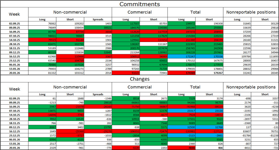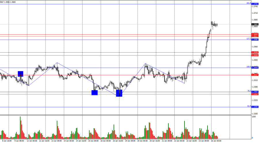 На часовом графике пара GBP/USD в пятницу продолжала процесс роста и по итогам дня оказалась над зоной сопротивления 1,3611–1,3620. Таким образом, рост британца может быть продолжен сегодня в направлении следующего коррекционного уровня 161,8% – 1,3755. Закрепление пары под уровнем Фибо 127,2% – 1,3595 сработает в пользу американского доллара и некоторого падения в направлении зоны поддержки 1,3526–1,3539. Ситуация с волнами поменялась на «бычью». Последняя завершенная волна вниз не пробила предыдущий лоу, а новая волна вверх пробила предыдущий пик. Информационный фон для британца был слаб в последние месяцы, но информационный фон в Америке – еще хуже. Быкам регулярно оказывает поддержку Дональд Трамп, что обеспечивает рост британской валюты. Информационный фон в пятницу с самого начала дня не сулил медведям ничего хорошего. Индексы деловой активности в секторах услуг и производства Великобритании оказались выше прогнозов, свою силу показал и отчет по розничной торговле. Таким образом, еще утром у быков появилось сразу три причины продолжать покупки GBP/USD. Во второй половине дня поддержку медведям мог оказать индекс настроения потребителей от Мичиганского университета, однако трейдеры предпочли отрабатывать геополитические события, которые обеспечили доллару падение больше чем на 200 пипсов всего за несколько дней. На мой взгляд, если Дональд Трамп в ближайшее время вознамериться провести военные операции в странах Латинской Америки или в Иране, это еще больше усугубит положение доллара. Любое новое посягательство на независимость FOMC может обернуться для доллара катастрофой. В 2026 году американская валюта падает, даже несмотря на нейтральную позицию ФРС. В то же время от Банка Англии трейдеры ждут дальнейшего снижения ставок, и даже этот фактор не поддерживает медведей. Как я не раз говорил в своих статьях, я не верю в завершение «бычьего» тренда по британцу.