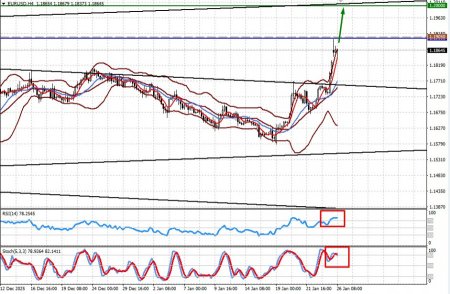 GOLD Цена на спотовое золото преодолела критическую психологическую отметку 5000 долларов за унцию. Учитывая описанный в статье геополитический фон, можно ожидать продолжения повышения его стоимости после локального отката к 5025.00 к 5200.00. Уровнем для его покупки может служить отметка 5044.00. EUR/USD Пара уверенно растет на волне геополитической слабости доллара, что может привести после небольшой консолидации пару к уровню 1.2000 после повышения выше отметки 1.1900. Уровнем для ее покупки может служить отметка 1.1905. Материал предоставлен компанией InstaForex - www.instaforex.com