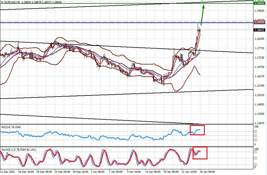 Трамп продолжает действовать в достижениях своих целей по принципу шаг назад и два шага вперед, что ярко проявляется в его очередных заявлениях после того, как в конце прошлой недели он «пообещал» Европе, что не будет захватывать Гренландию. Американский президент никак не уймется и снова угрожает северному соседу, Канаде, 100% пошлинами, если она достигнет торгового соглашения с Китаем. Это указывает на то, что он будет добиваться своего любыми методами, следуя принципу шаг назад и два шага вперед. Постепенно ослабляя давление на гренландском, латиноамериканском и канадском направлениях, он вновь и вновь воскрешает свои требования, заходя к достижению целей с разных сторон. Конечно, в такой ситуации финансовые рынки не могут однозначно оценивать более долгосрочное вероятное развитие событий и колеблются с общей динамикой развития событий. Итак, на волне геополитических рисков и понимания того, что в новом мире гегемония доллара, скорее всего, отойдет на второй план, а золото может стать на какой-то период временим международным платежным средством, центральные банки и другие крупные рыночные игроки только усиливают покупки физического золота, которые тянут вверх котировки фьючерсных контрактов. Отметка 5000 долларов была сегодня утром преодолена, и можно ожидать после технического закрепления выше нее дальнейшее повышение. Но интересным является и радикальная смена отношения инвесторов к доллару. Вероятность того, что в безумии противодействия Трампу Европа начнет «сбрасывать» купленные ранее казначейские обязательства Правительства США, что в совокупности с ожиданием представления кандидатуры нового главы ФРС, приводит к заметному падению интереса к долларовым активам и, конечно, к самой американской валюте. Что касается кандидатуры, то консенсус-прогноз предполагает, что на фоне претензий уголовного характера со стороны Трампа к председателю ФРС Пауэллу кандидатом будет лояльный президенту человек, исповедующий более мягкий денежно-кредитный курс. И при таком варианте развития событий следует ожидать не двух, как сейчас полагает рынок, снижений процентных ставок в текущем году, а, возможно, даже три или четыре. Эти перспективы также являются важной основой пессимистического отношения к американской валюты на рынке Форекс. Что можно ожидать сегодня на рынках? Полагаю, что нынешняя общая тенденция для золота, доллара, криптовалют и рынков акций сохранится. Прогноз дня: